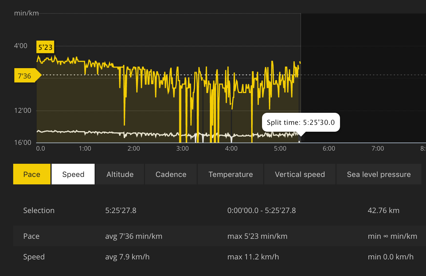 松拓记录的配速数据,可以看到,头2个小时,配速基本还是能稳定在5分半到6分钟的样子,下半程配速就断崖式降落了,惨不忍睹。