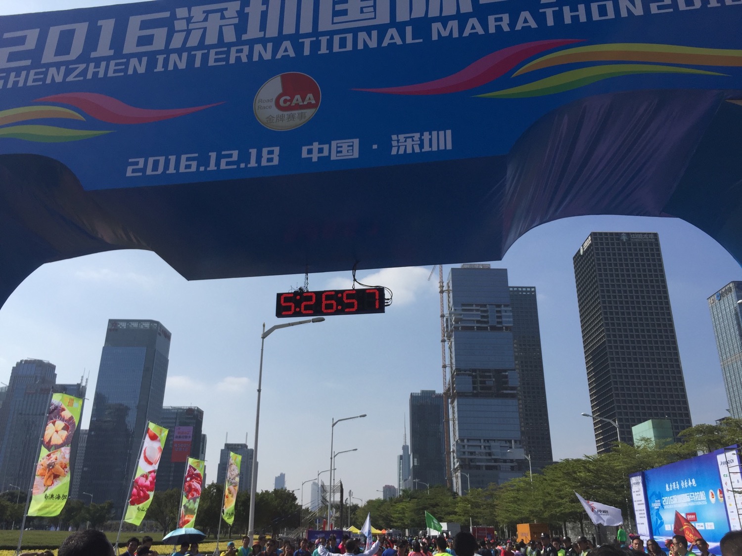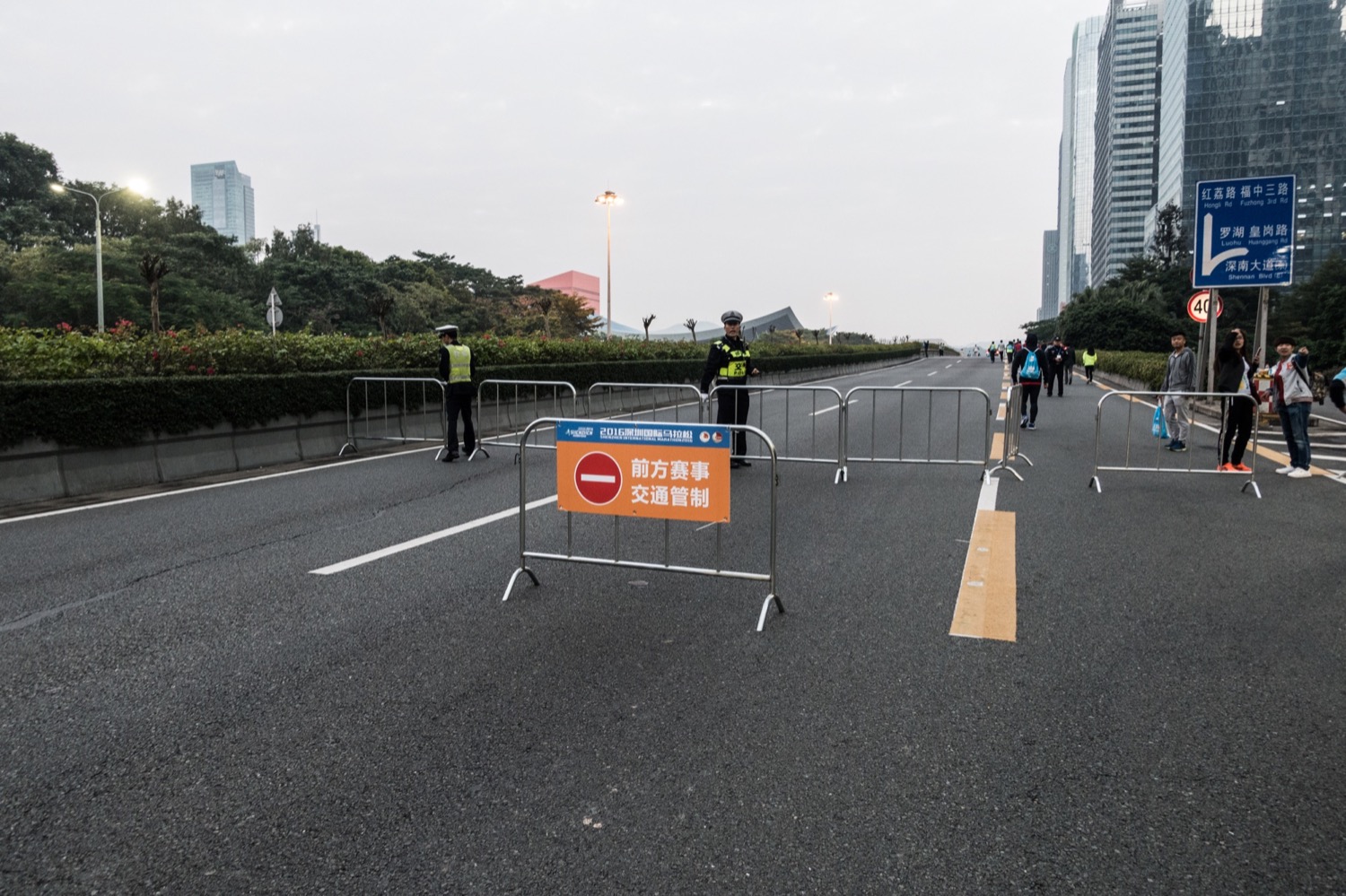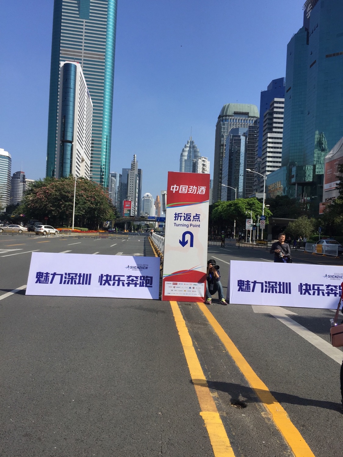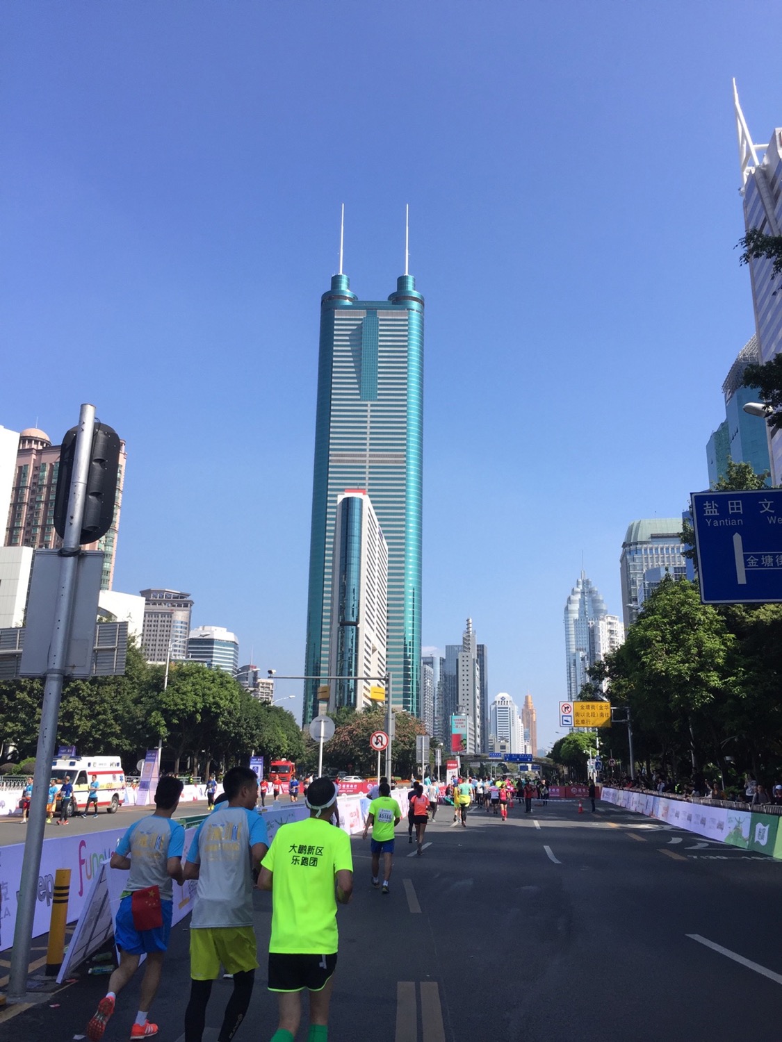 最后5公里的折返点,前头蓝色的大楼就是深圳的老地标「地王大厦」。