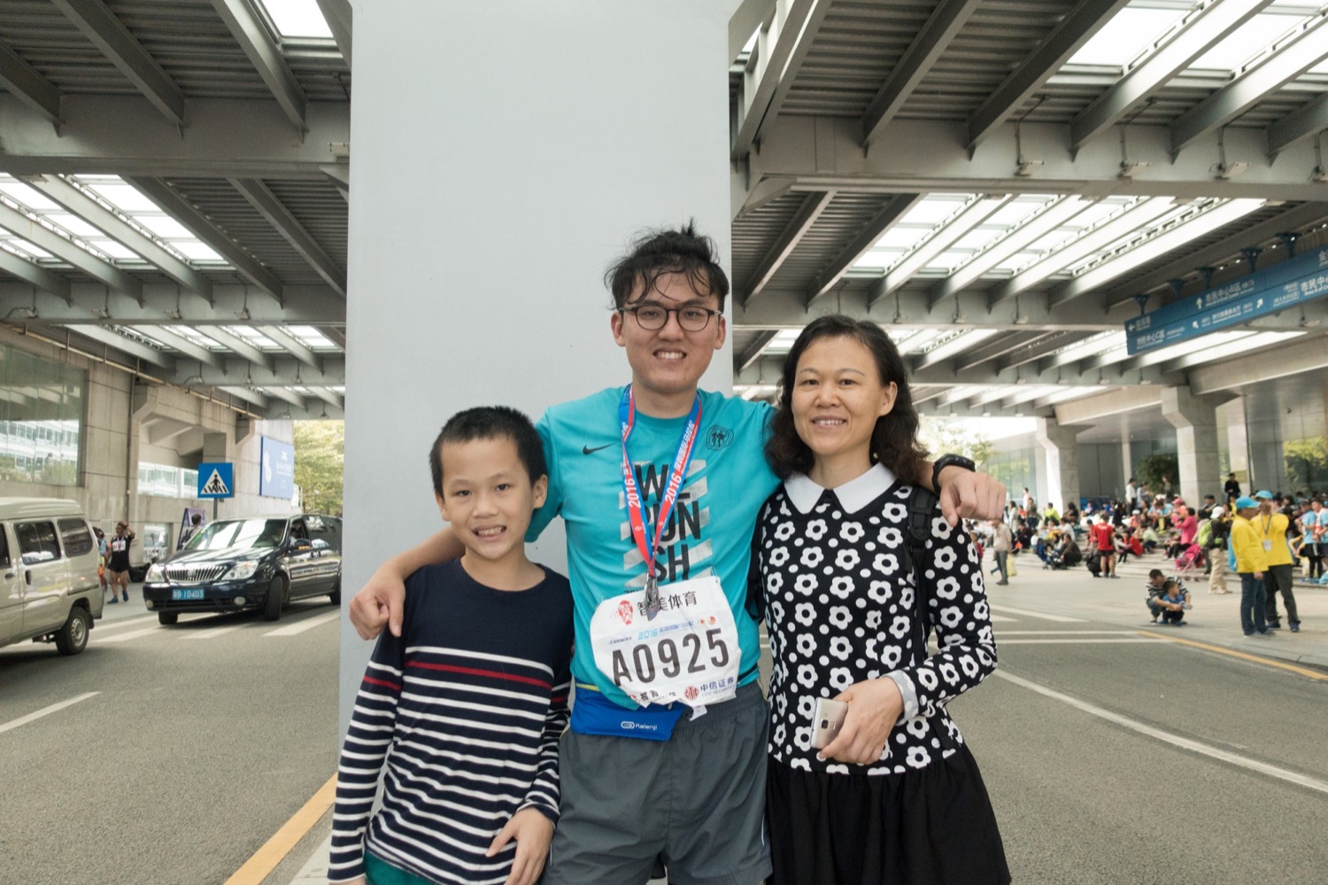 十分开心,这一次跑马,妈妈,弟弟还有杨左,在终点前面一百多米的马路边等我,本来她们是打算在深圳湾给我加油的,结果我跑过了,她们还没来。