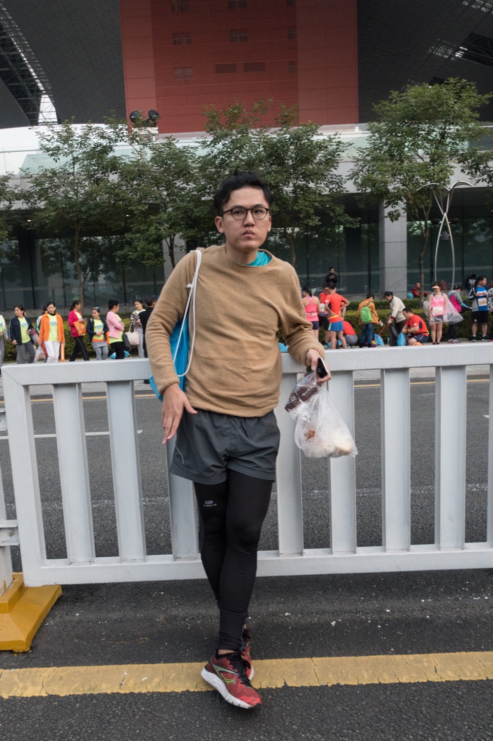 这次马拉松,忘记带腰包,忘记带跑步眼镜,也忘记带运动外套,早晨还是有点冷,里面穿着短袖的T恤,外面套了个毛衫保暖。坐车过来路上已经吃了三个面包,离起跑还有一个钟,再吃点积累能量。