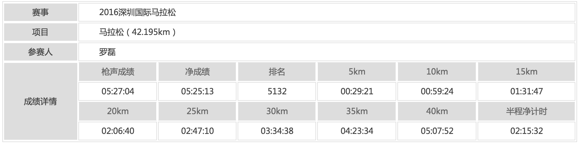 枪声成绩5小时27分。