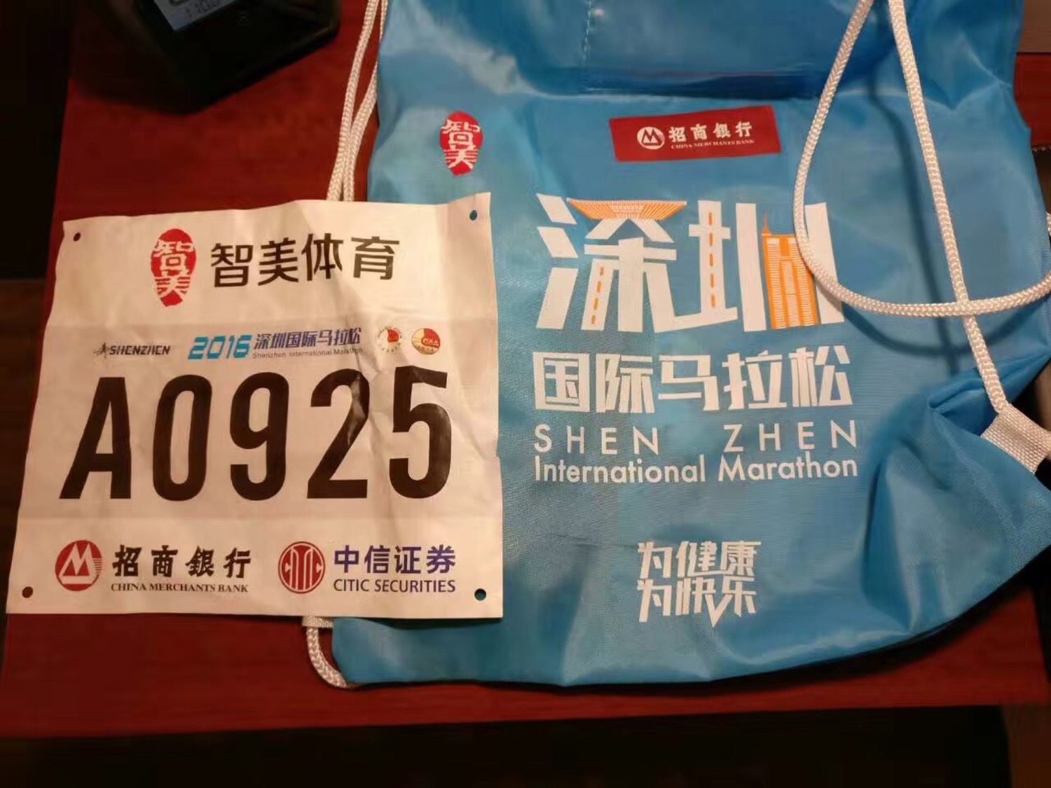 这一次深圳马拉松改由智美承办,相比以前的承办商靠谱了不少。招商银行、中信和华为几个大赞助商,送了挺多「广告」。准备好参赛用品,12点才睡觉。