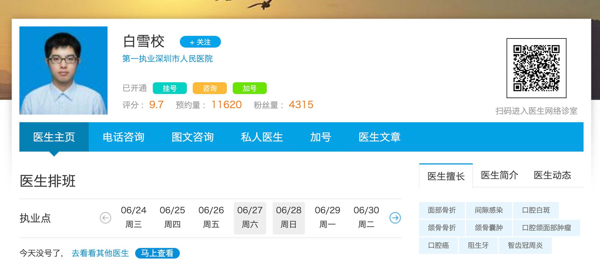 「北大口腔医学院」属于国内最好的口腔本科院系之一,关于白医生的资历,就不多说了,建议大家可以去搜一下患者的评论。现在要约好医生还是挺难的,建议大家还是提前约。