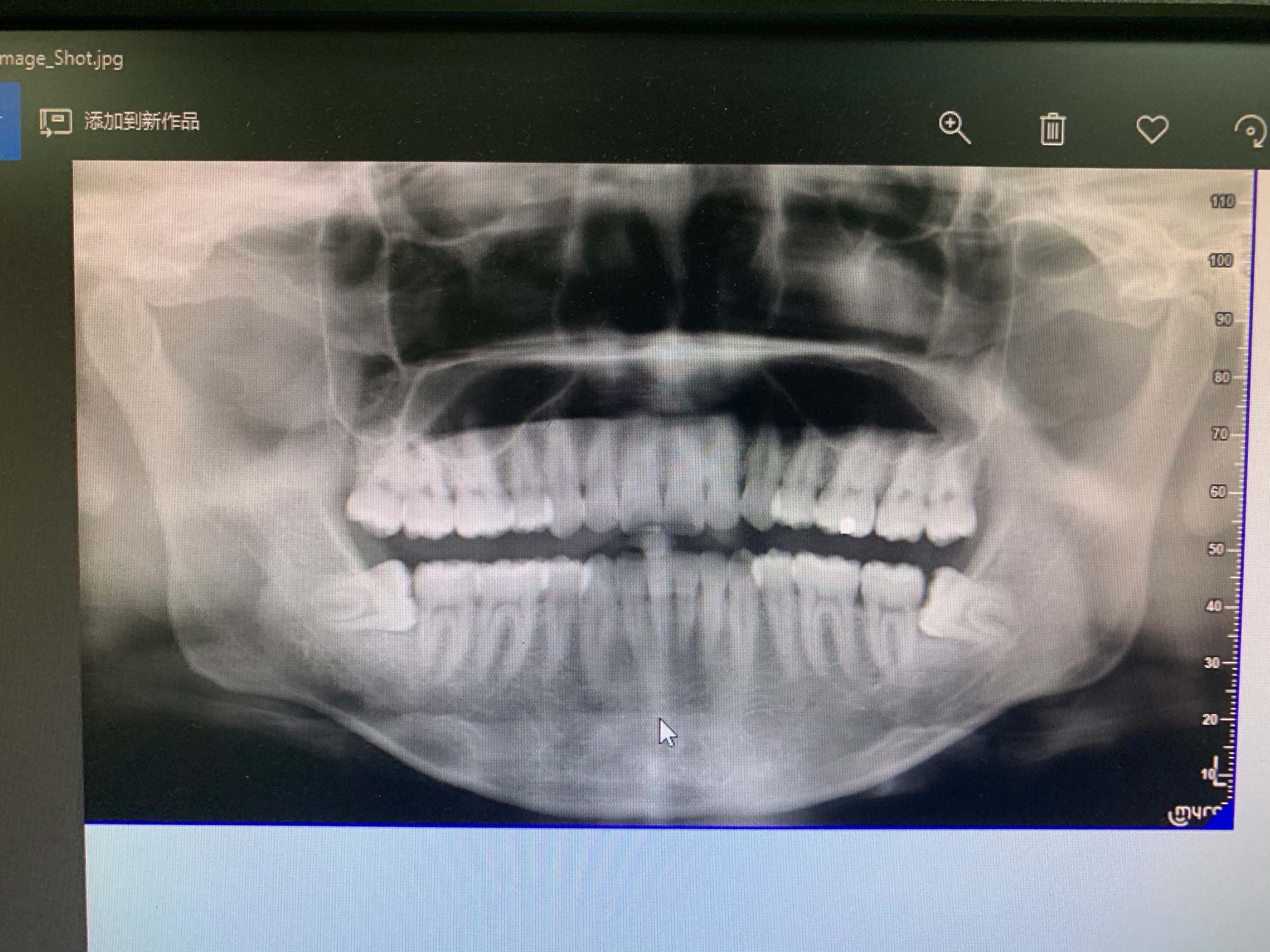 拍片检测费¥69元,可以刷医保,CT室就在一楼,等了一会,10分钟搞定,拍完后直接传到医生的电脑上,上面这就是我的片,可以看到,左右两边下方的阻生齿,位置还是挺尴尬的,如果不管的话,以后肯定会顶到并且损害旁边牙齿的牙根。