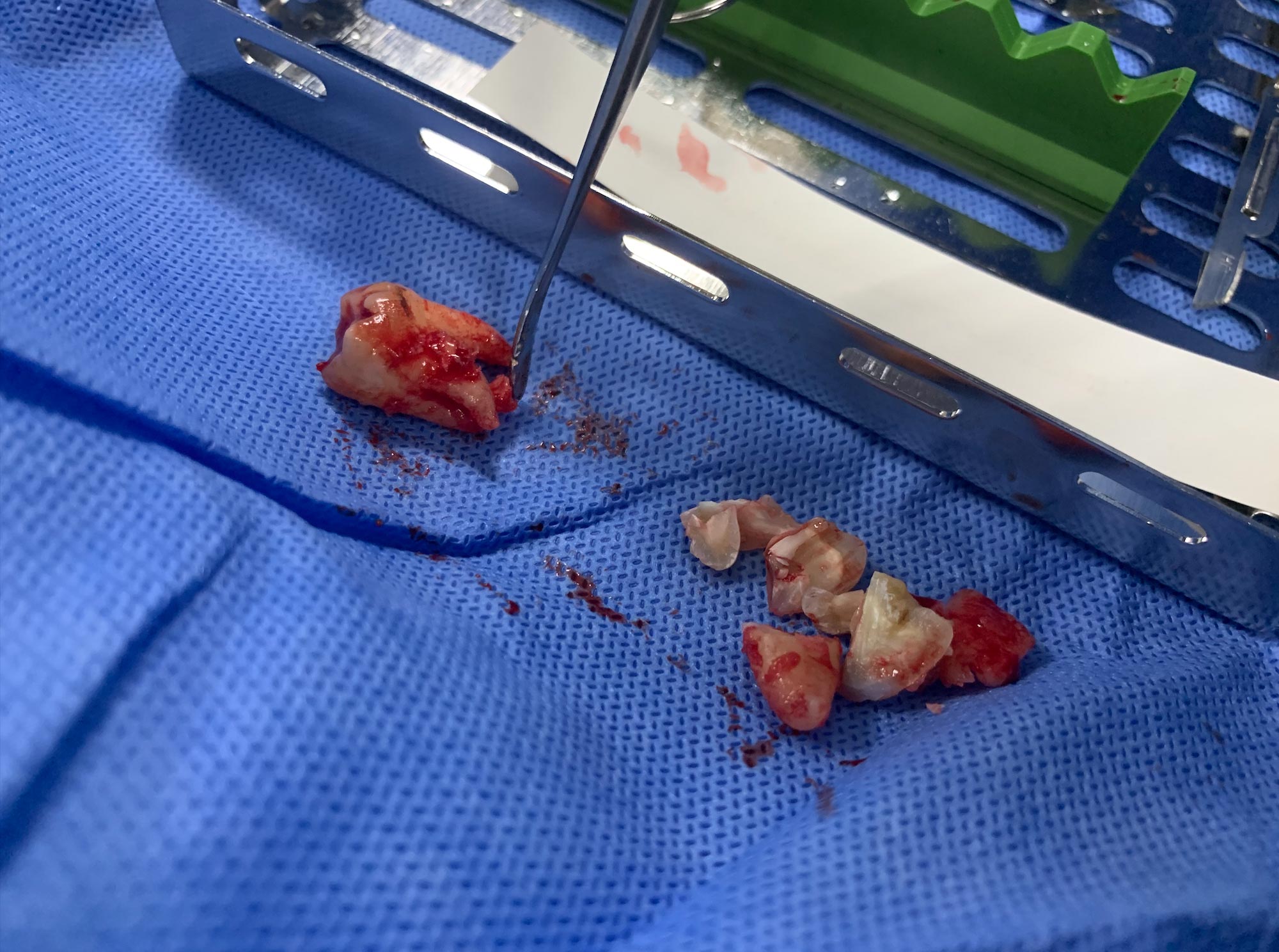 - 接下来拔上方的智齿,由于比较好拔,大概一分多种就拔下来了,完整的一块。