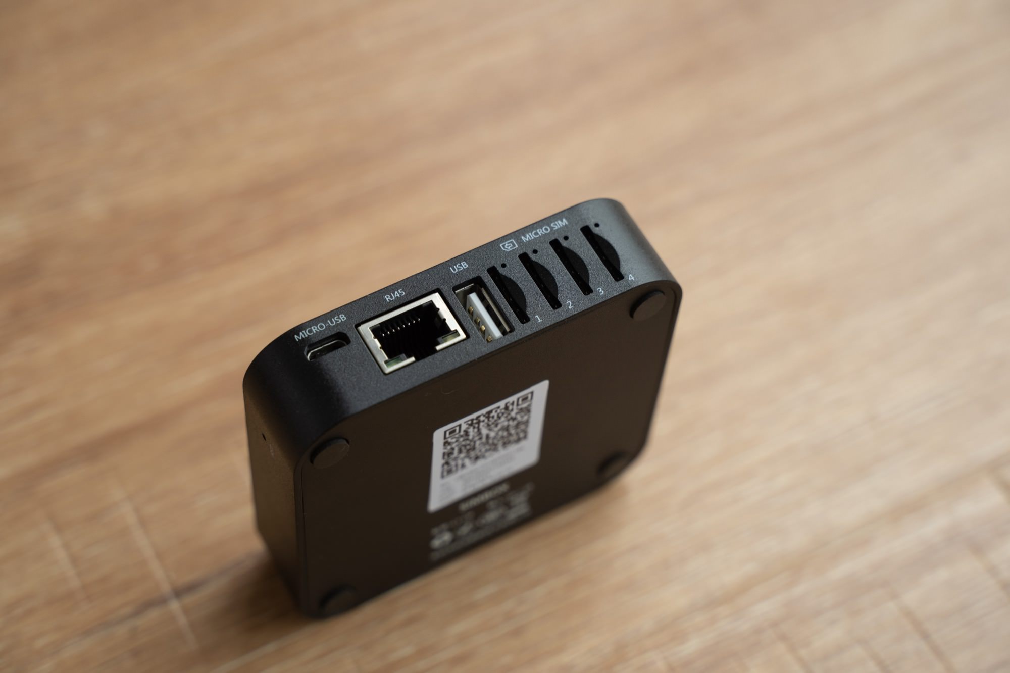 SIMBOX 接口一览,有一个USB充电接口,一个标准网线接口,一个USB接口(但是好像没什么好用,我看新版后来取消掉这个USB接口了),四个SIM卡槽。