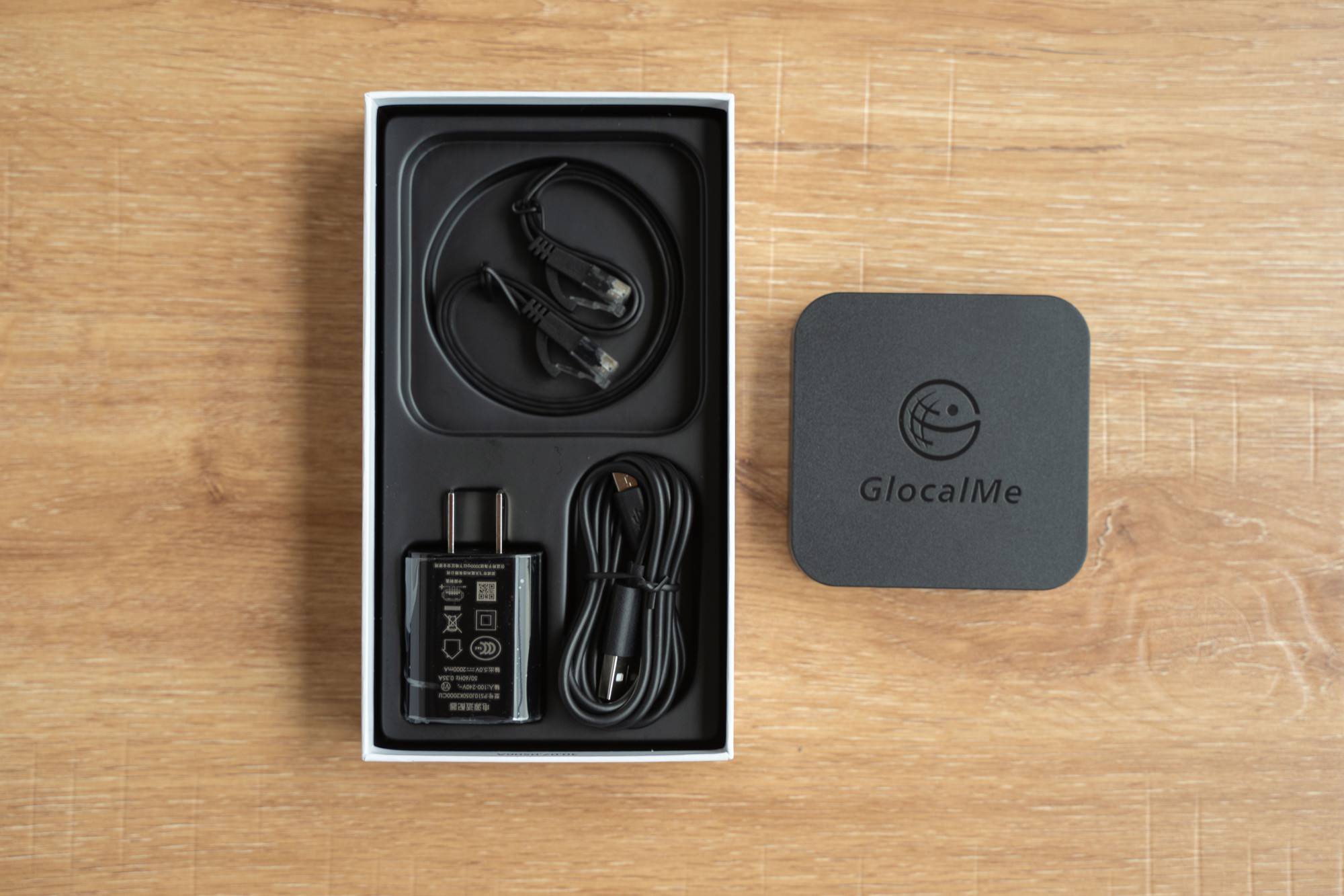打开包装盒后,里面的全部东西,黑色的SIMBOX有点像小一号的小米盒子,另外配有一个USB充电头、一个充电线,还有一根网线。