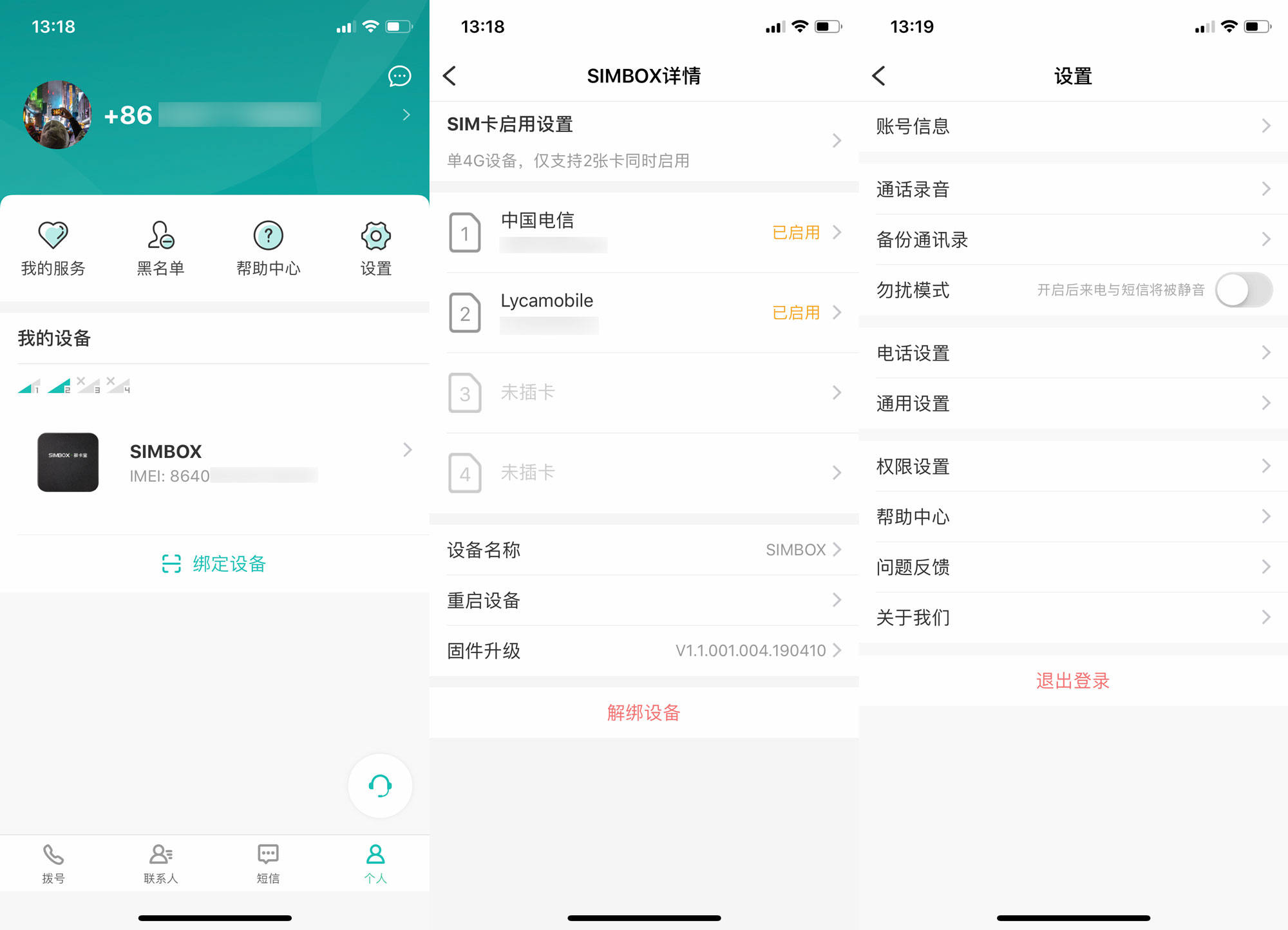 需要注意的是,SIMBOX这个不管是拨打电话还是接发短信,都要有网络。SIMBOX实体可以留在家中,接上网线即可,自己出门在外,则需要使用APP,通过WIFI或者4G网络来使用。