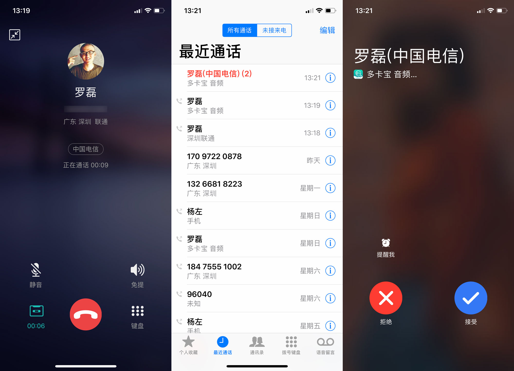 中间是iPhone原生电话界面,由于有Callkit,显示最近通话来源是「多卡宝 音频」。