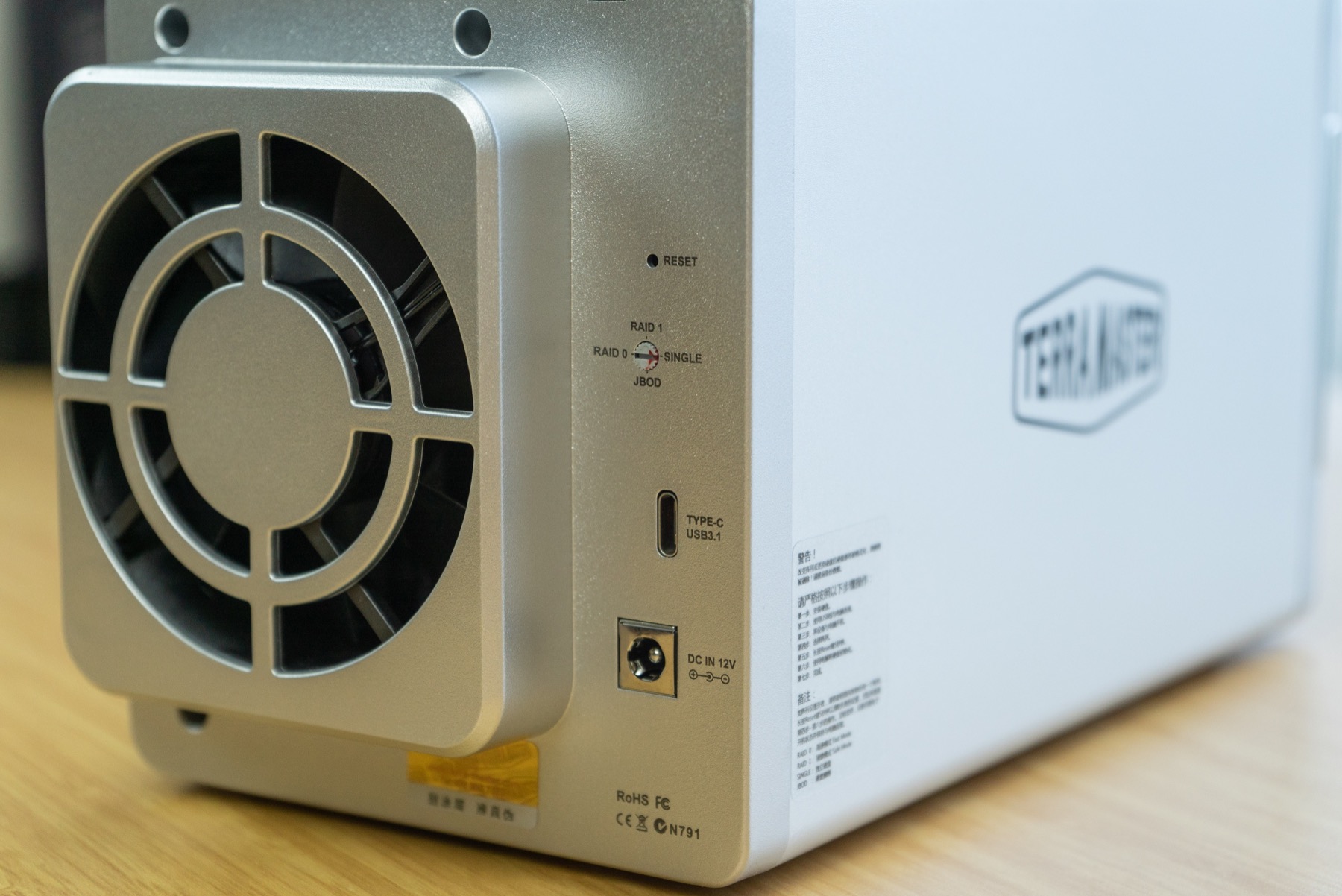 背面最上面的是RESET孔,下面有一个小转盘(需要用送的小螺丝刀转动切换)是用来切换阵列的磁盘模式,能够再RAID0/1、JBOD、SINGLE四种模式进行切换,有一个TYPE-C USB3.1接口,如果你有双头TYPE-C的线,也可以直接跟Macbook连接,不用转接头。