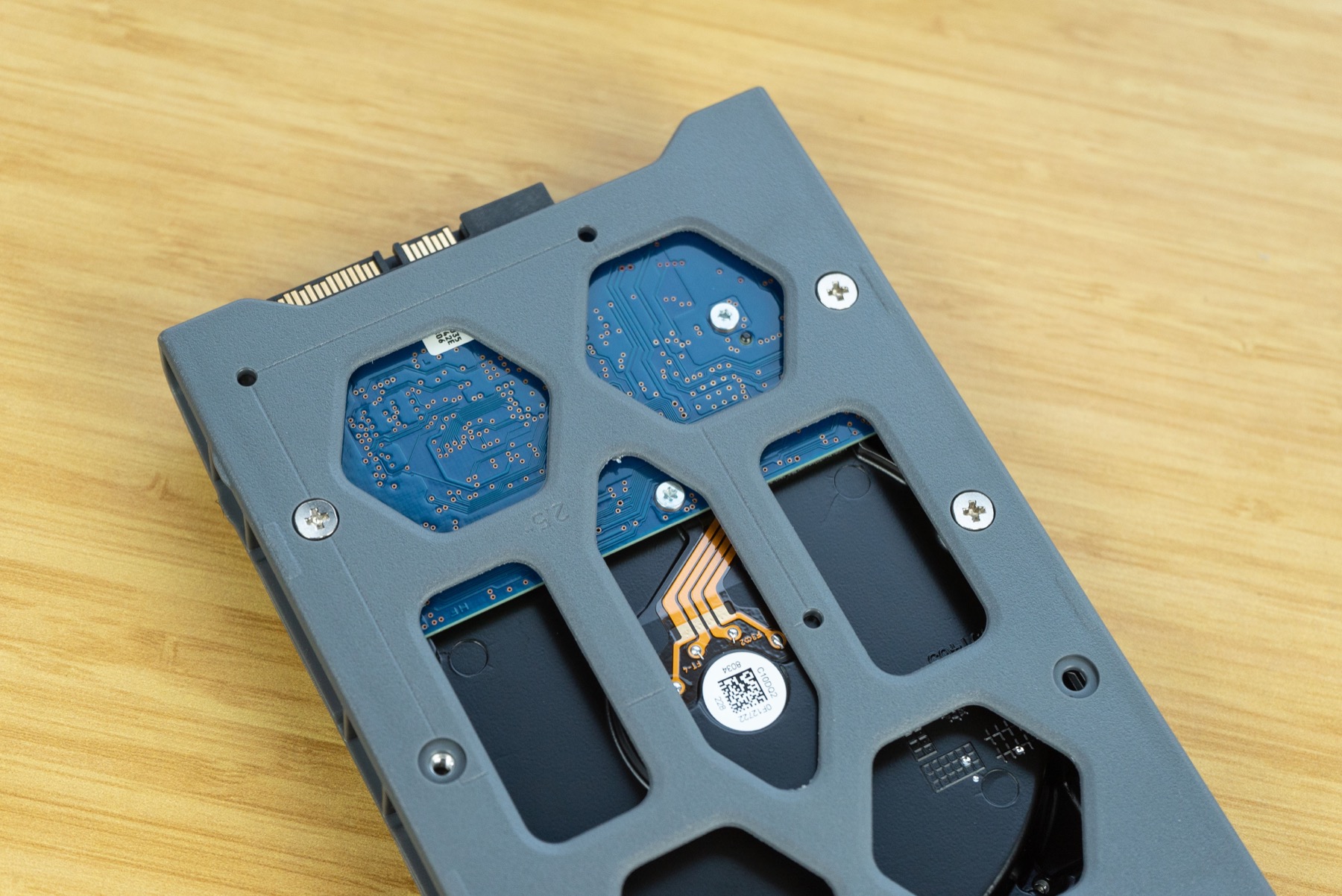 3.5寸硬盘通过螺丝固定在硬盘卡位上。