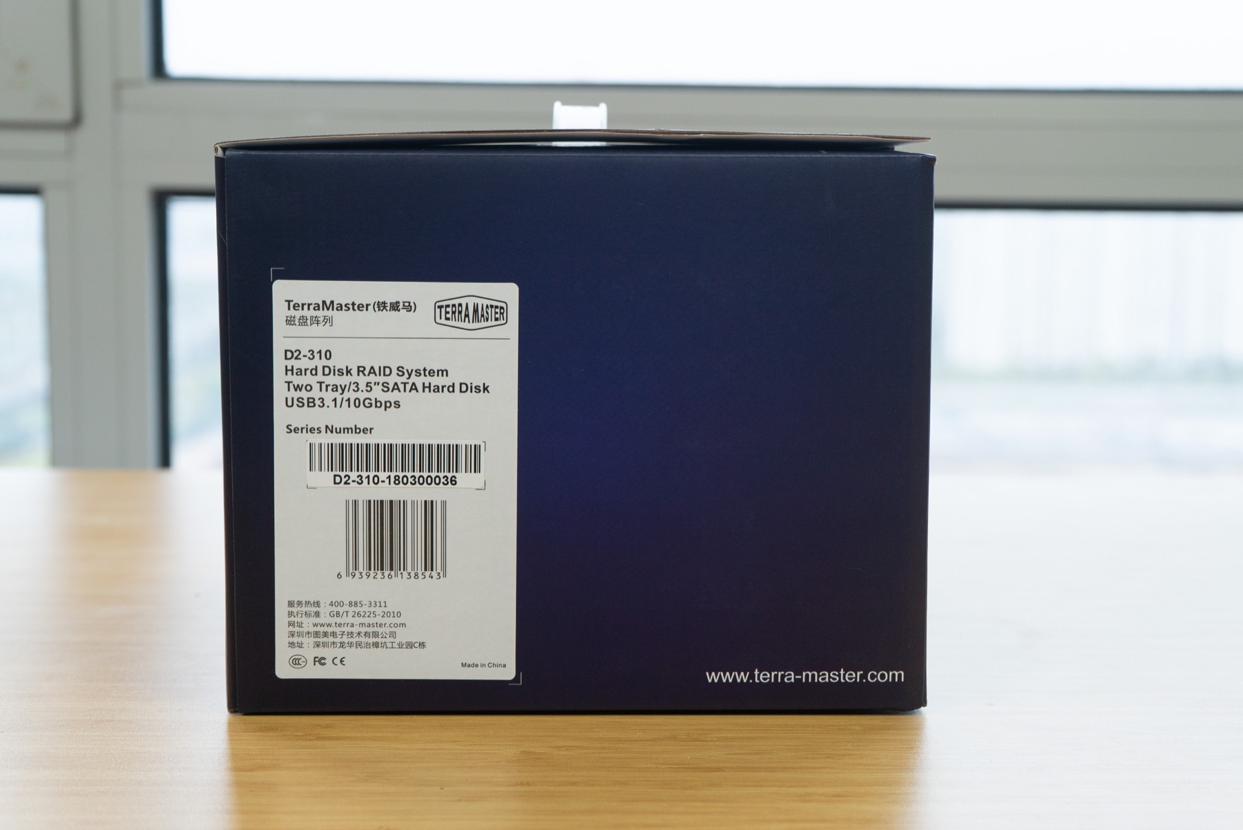 背面的白色标牌,写着产品名称和基本参数,之所以选择D2-310,USB3.1/10Gbps这个是十分关键的参数,有不少RAID和硬盘盒是USB3.0的,最高只有5G的带宽,甚至跑不满有些SSD的速度,建议现在就不要再选择USB3.0的硬盘盒了。
