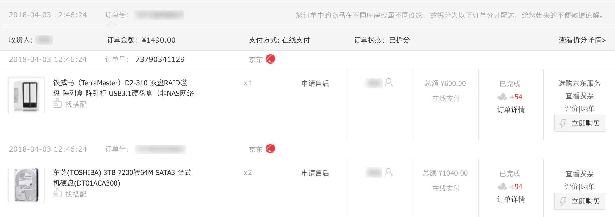 最后,我换了另外一个方案,也就是今天开箱的主角铁威马TerraMaster D2-310搭配两块3T东芝硬盘的组合,加起来价格才1600多,比1TB的 SSD 便宜不少。