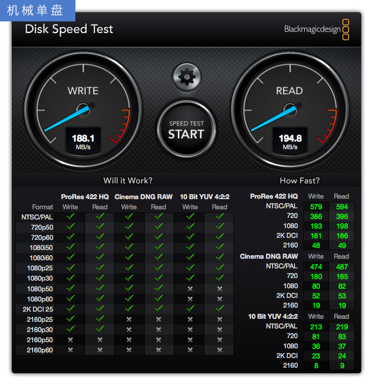 这一次我是使用的两块是东芝(TOSHIBA) 3TB 7200转64M SATA3 台式机硬盘,首先是单盘模式,Mac通过TYPE-C线直连,读稳定在190MB/s,写稳定在195MB/s左右。