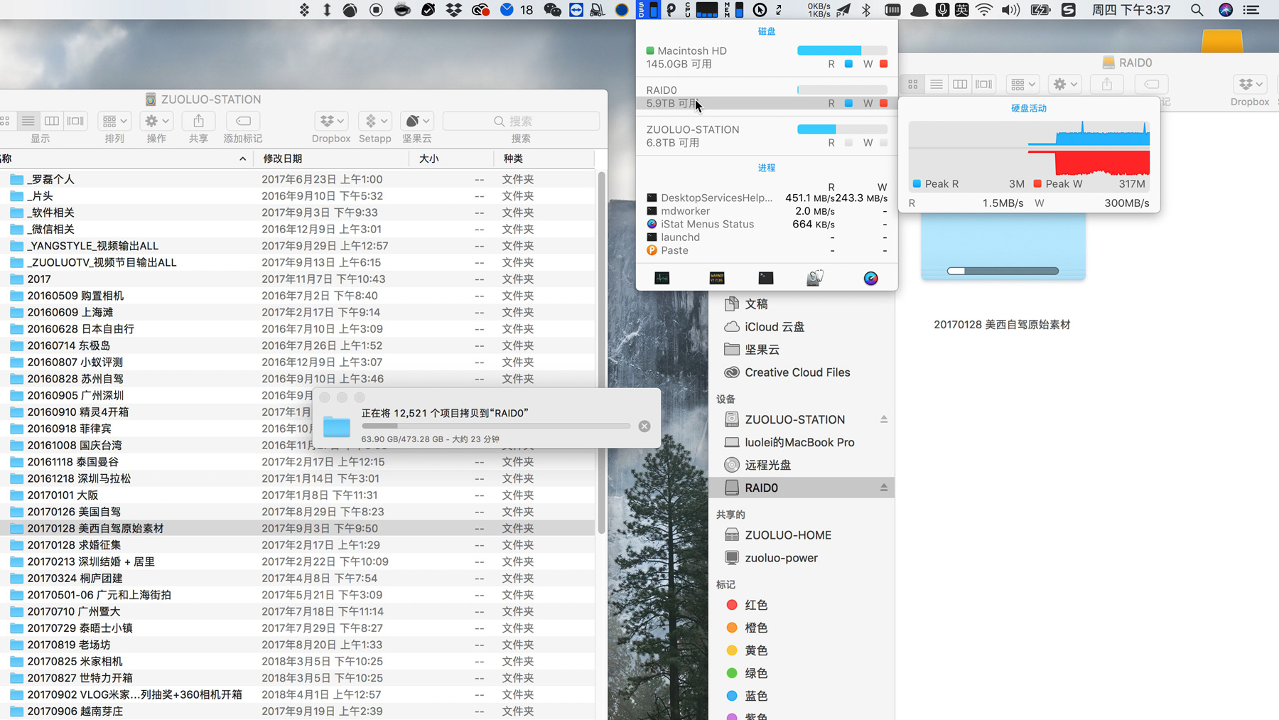 接下来测试下实际文件拷贝的情况,我通过雷电接口,直接把世特力里面的一个473G的文件夹(里面有大量照片、视频)通过USB3.1拷贝到铁威马硬盘盒,只需要24分钟左右,系统监控里看到此时硬盘写入大概是300M/s。