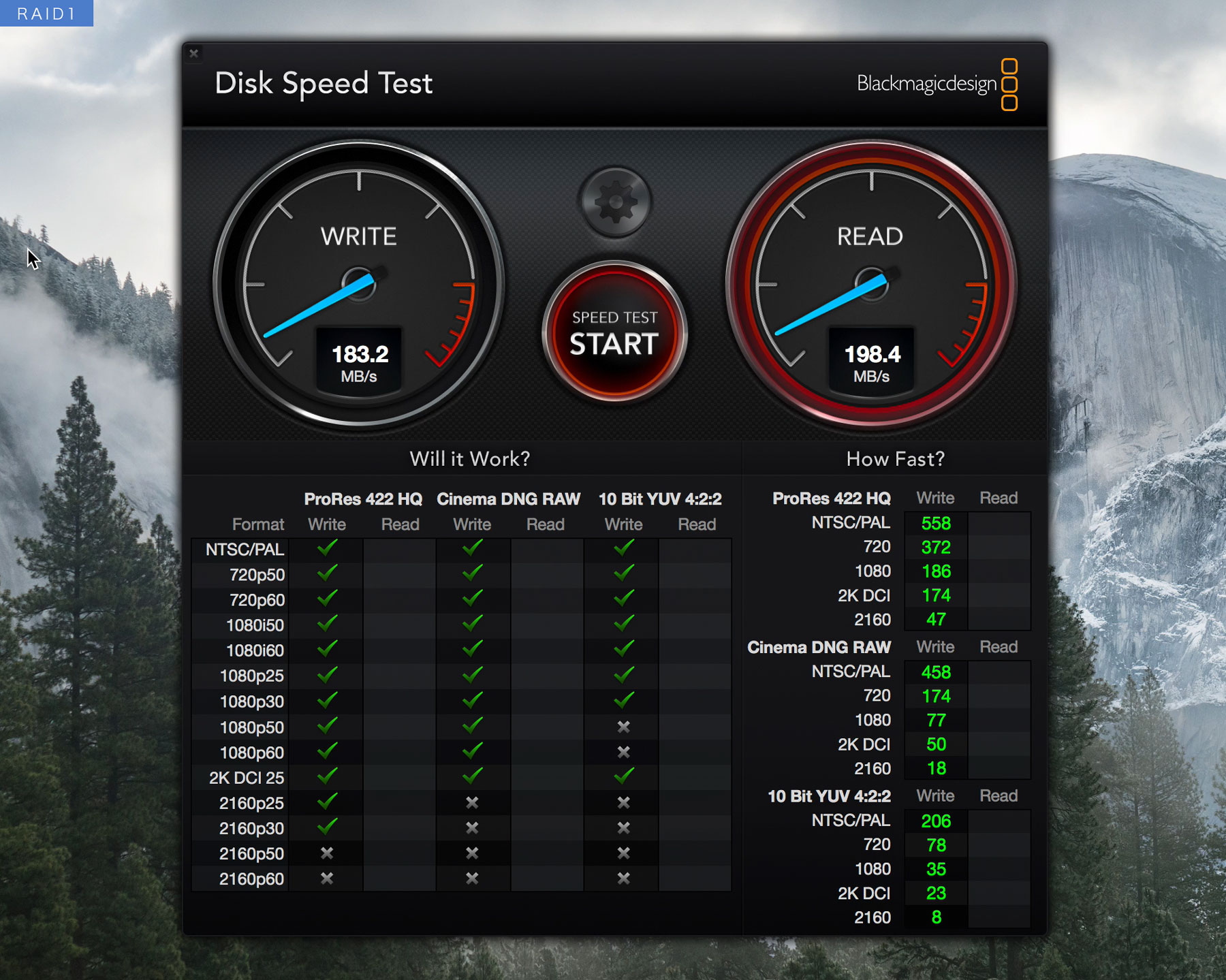 于是,去年我升级到5000块的硬盘盒: 世特力雷电2磁盘阵列,搭配5块3T东芝硬盘,组了一个 RAID5 阵列,总共 12TB的磁盘空间,写入速度差不多是380MB/s,读取速度670MB/s,已经算是很炸裂的。