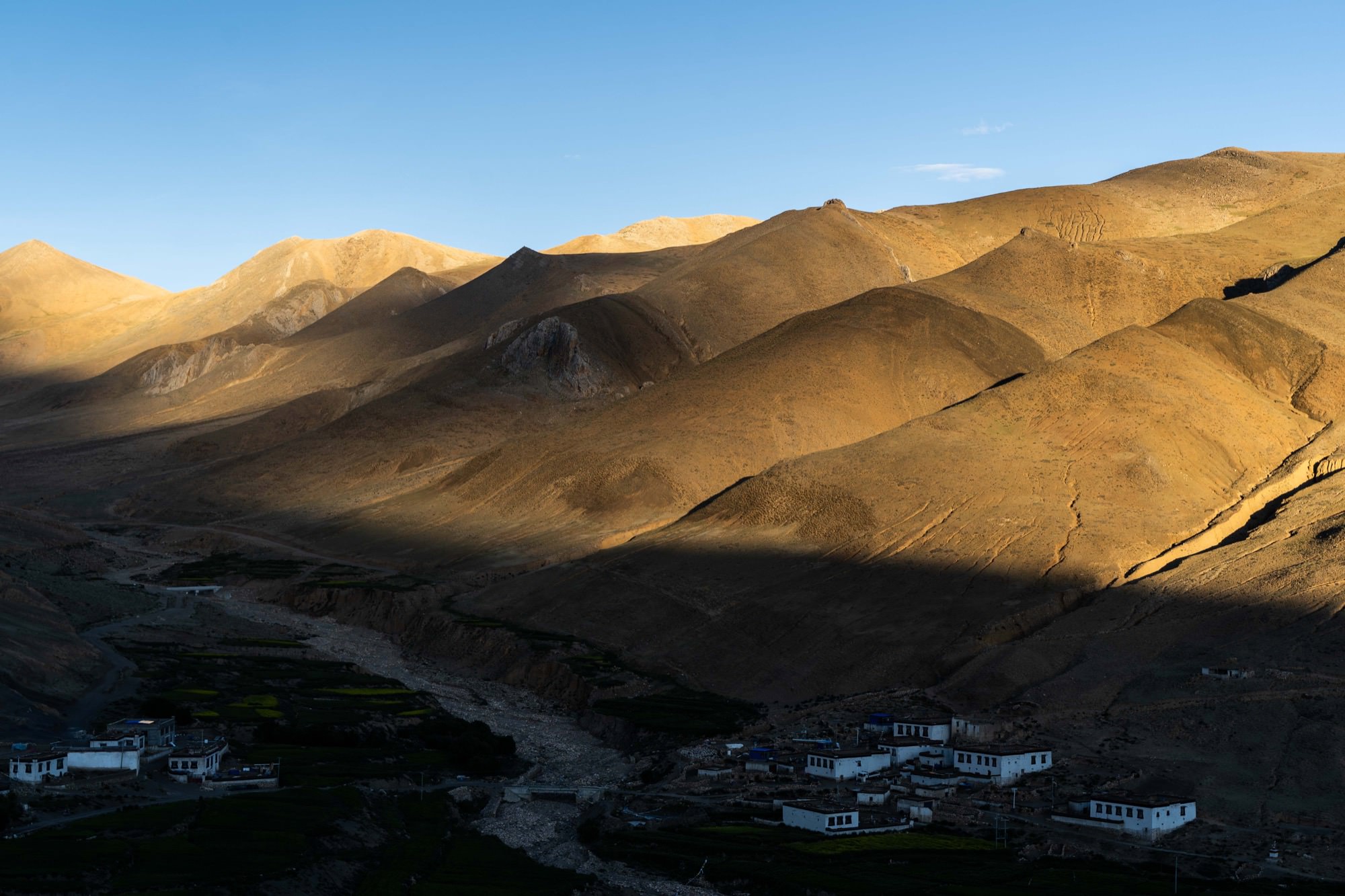 太阳慢慢落山了,阳光撒在山谷中,切出一条分隔线。