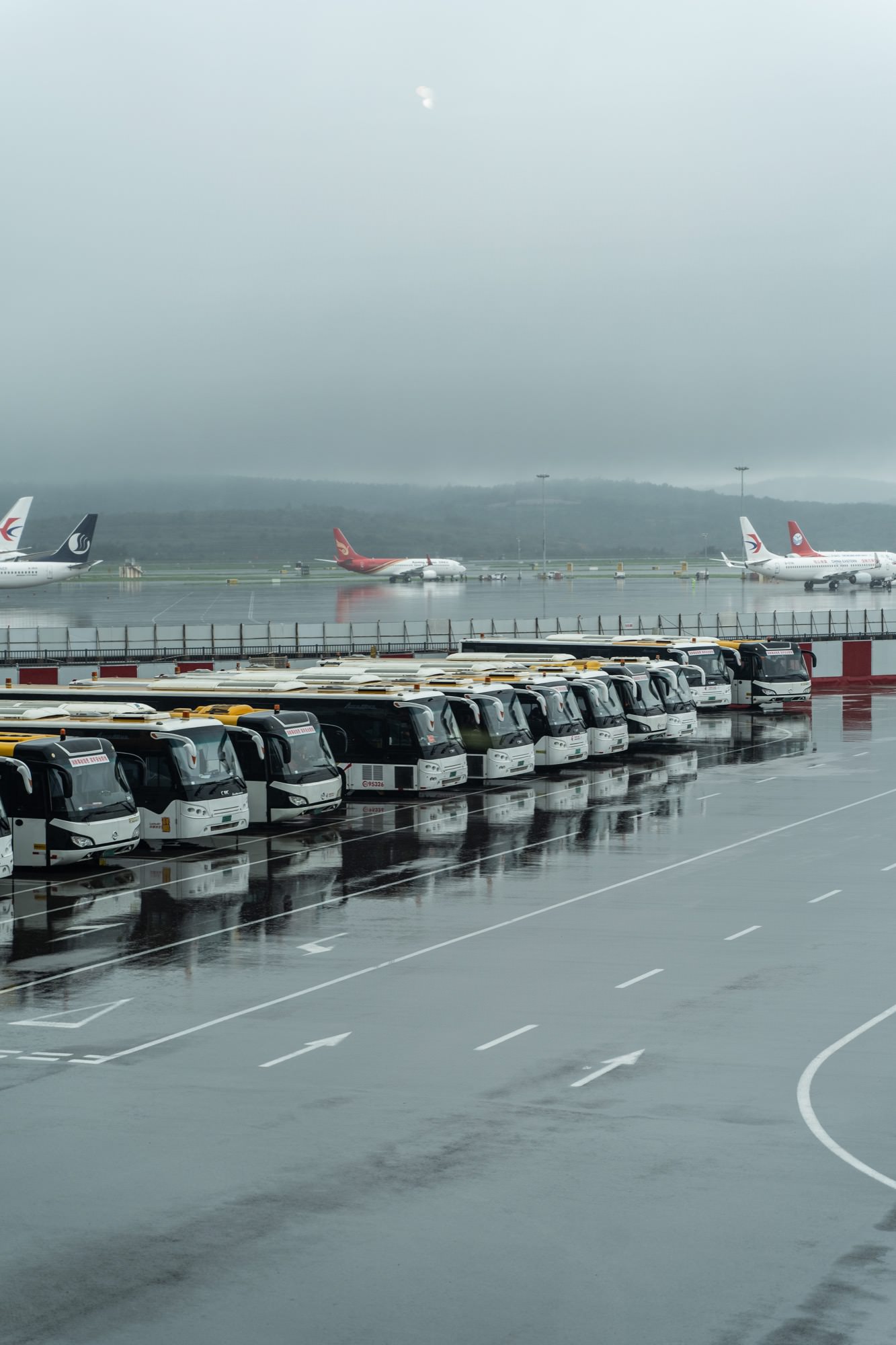 整个天都是雾蒙蒙的,机场大巴满满一排。