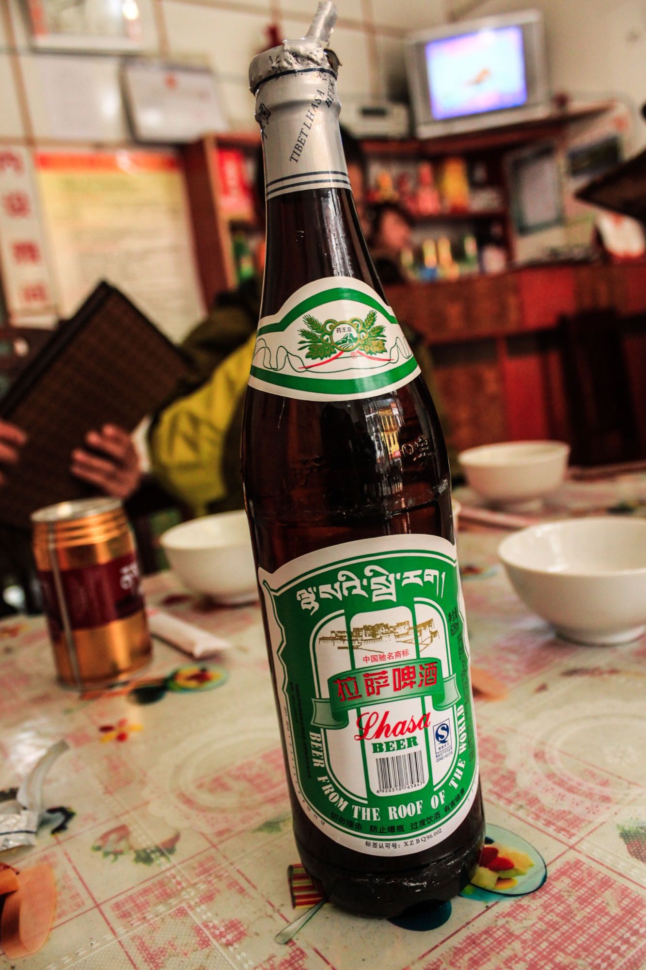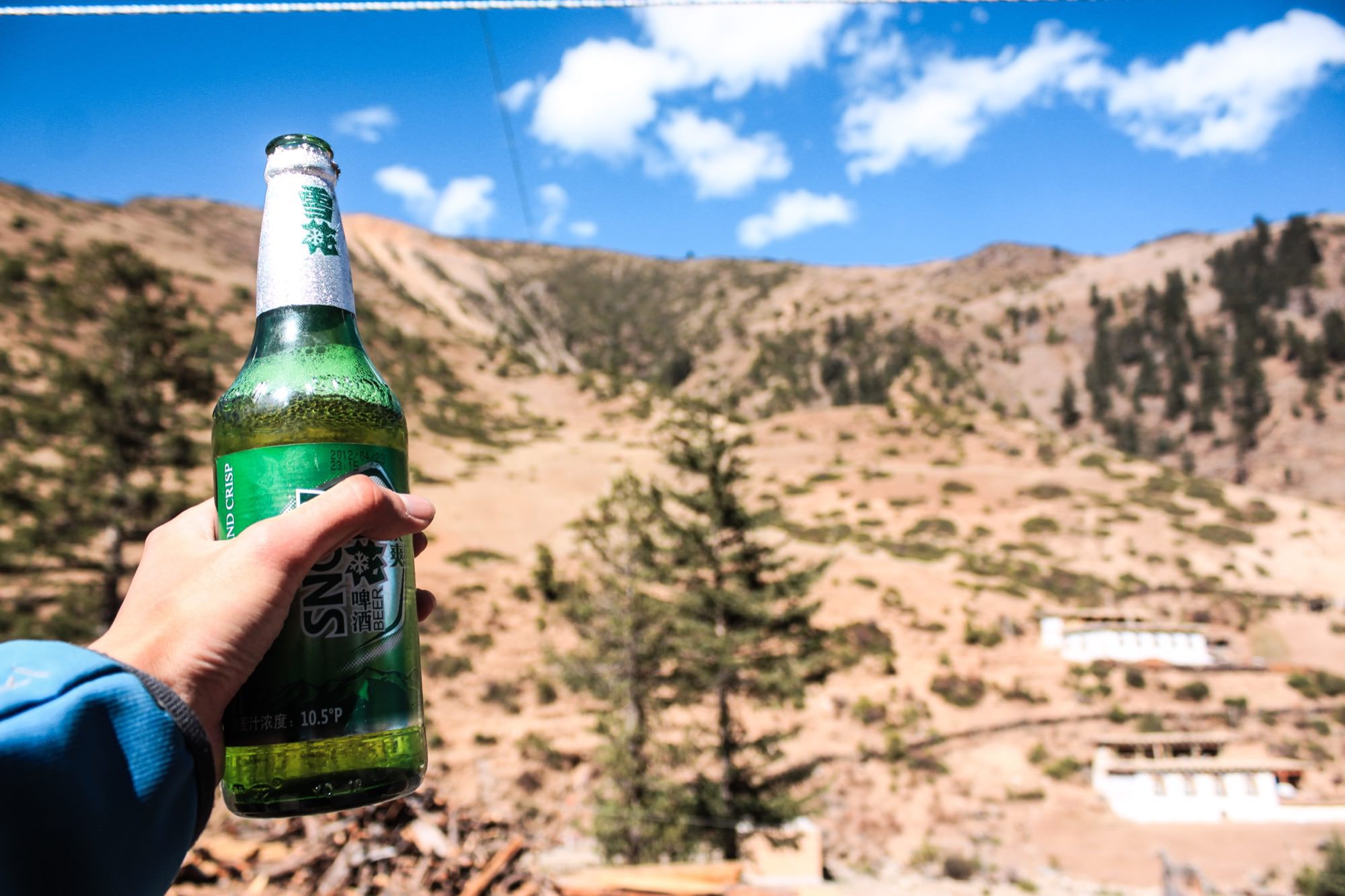 到达波密,波密海拔不高,喝上一瓶拉萨啤酒。