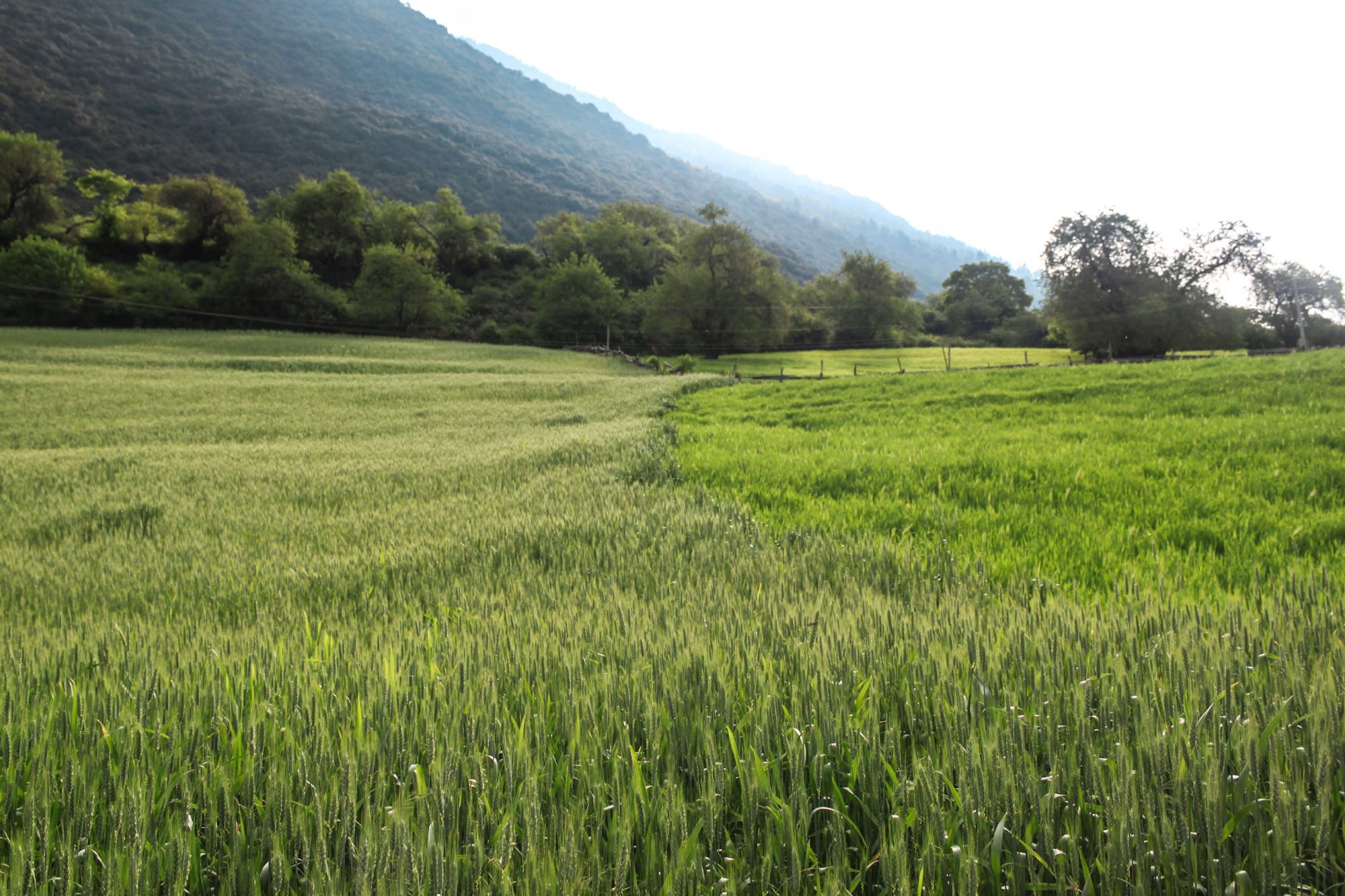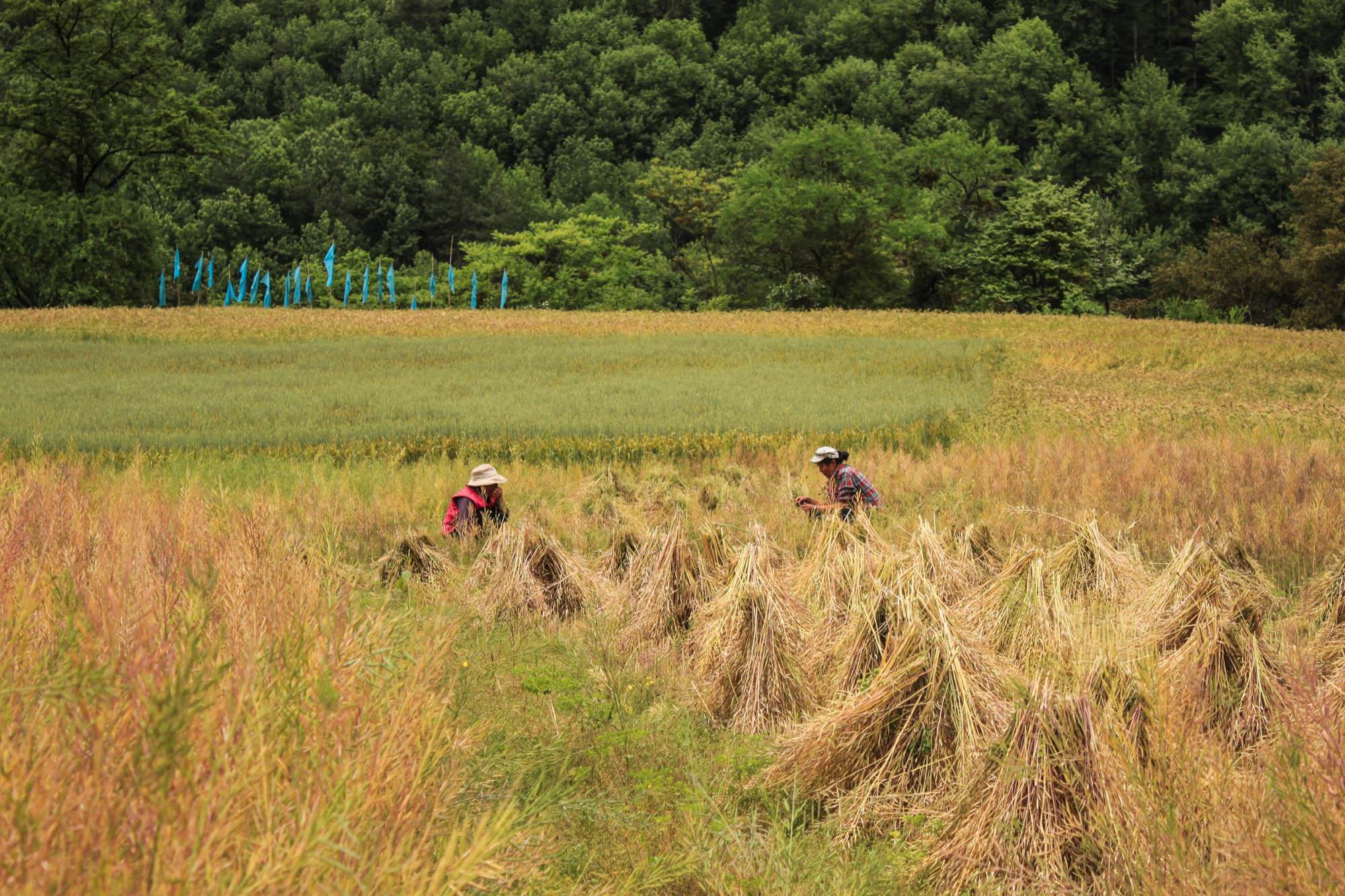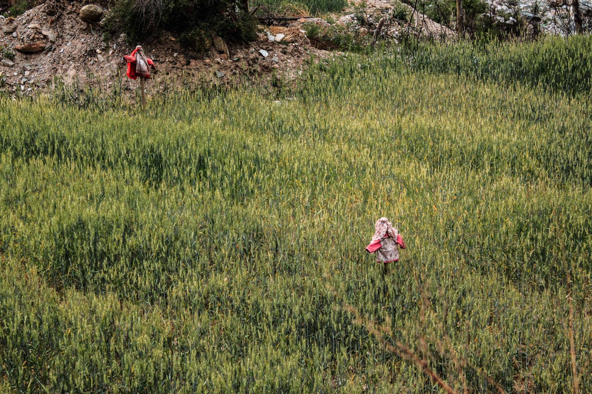 气候随着海拔变化很大,山沟里有不少农田了,为了赶鸟,田里有几个稻草人。