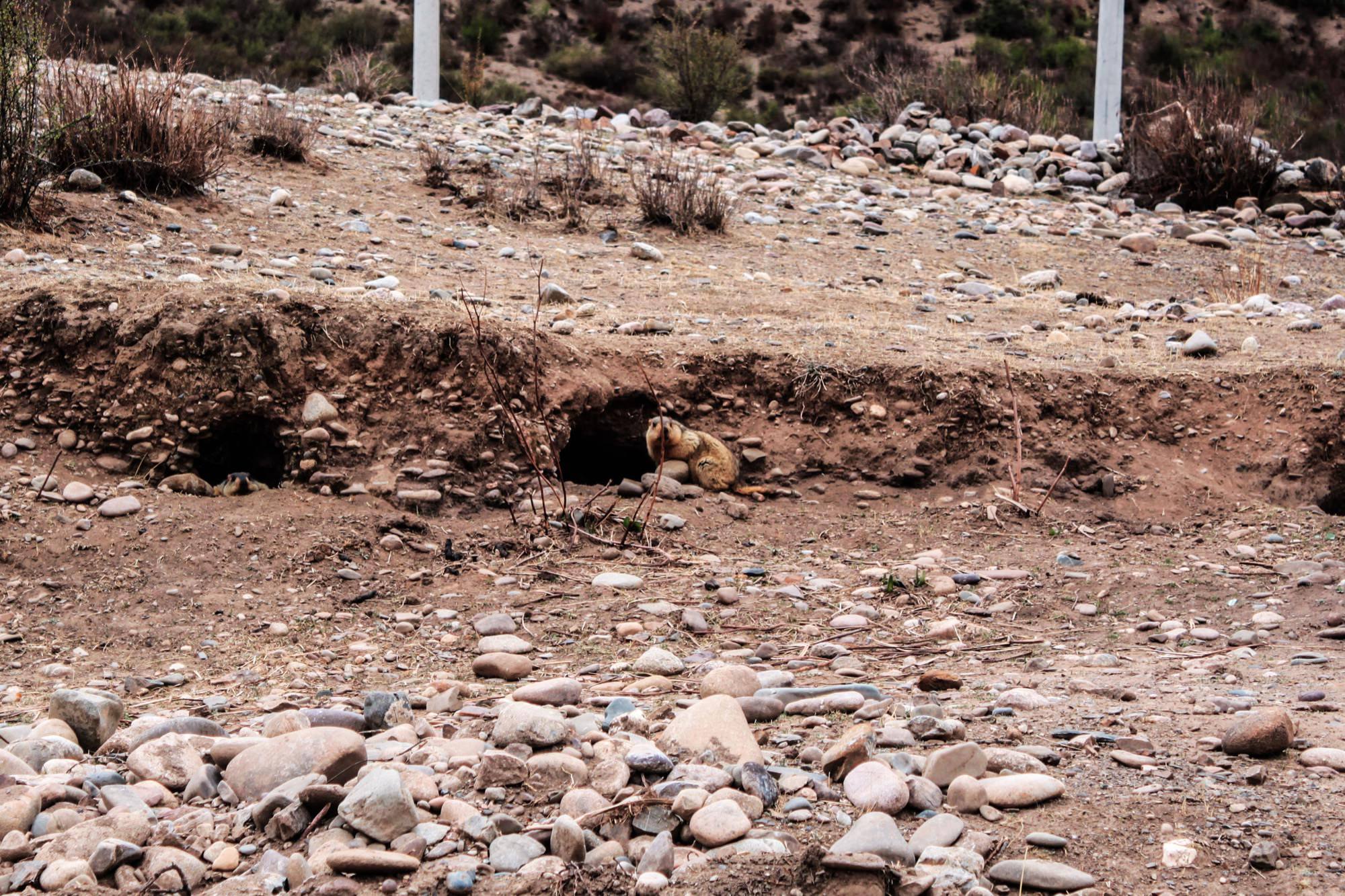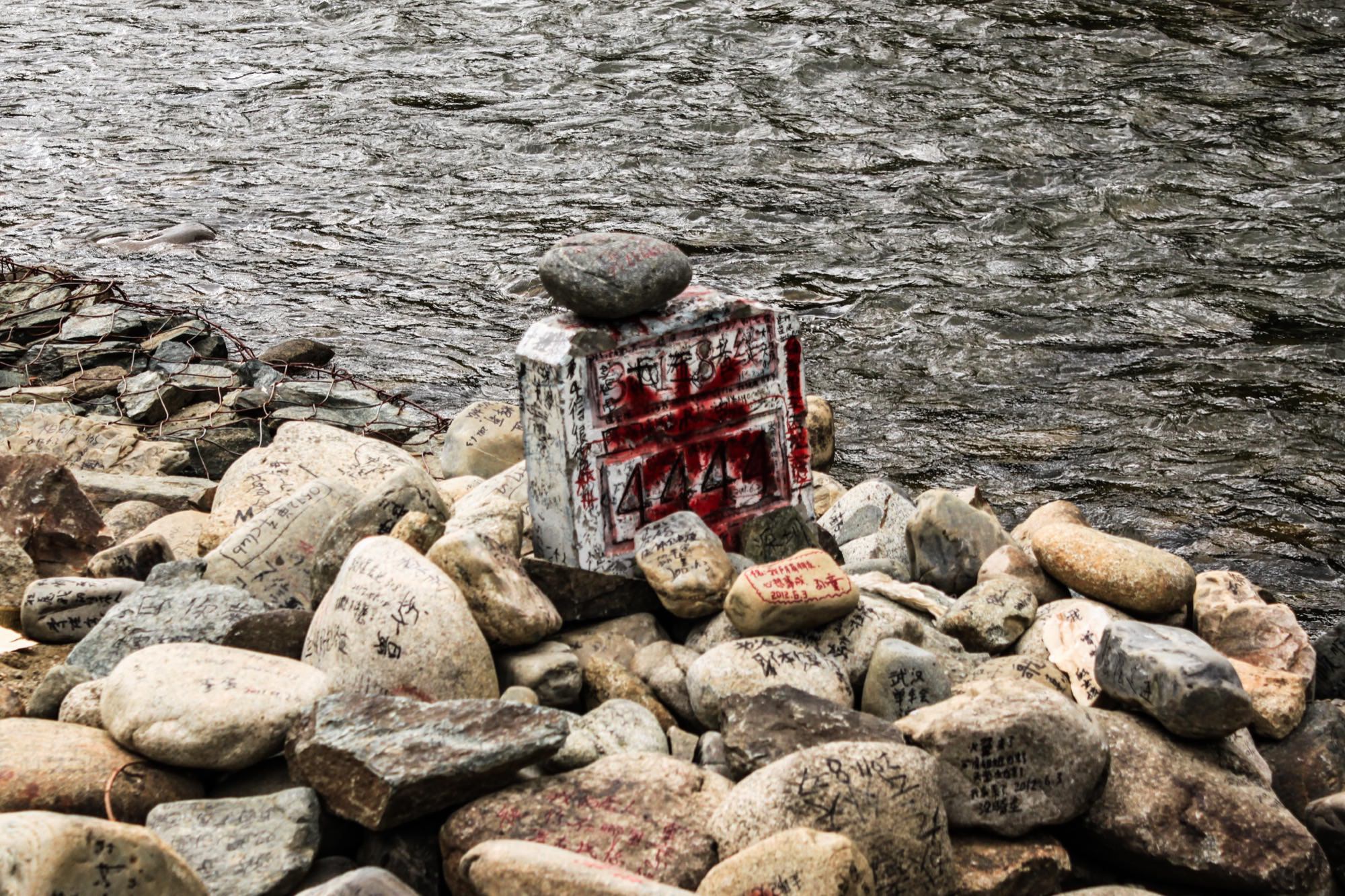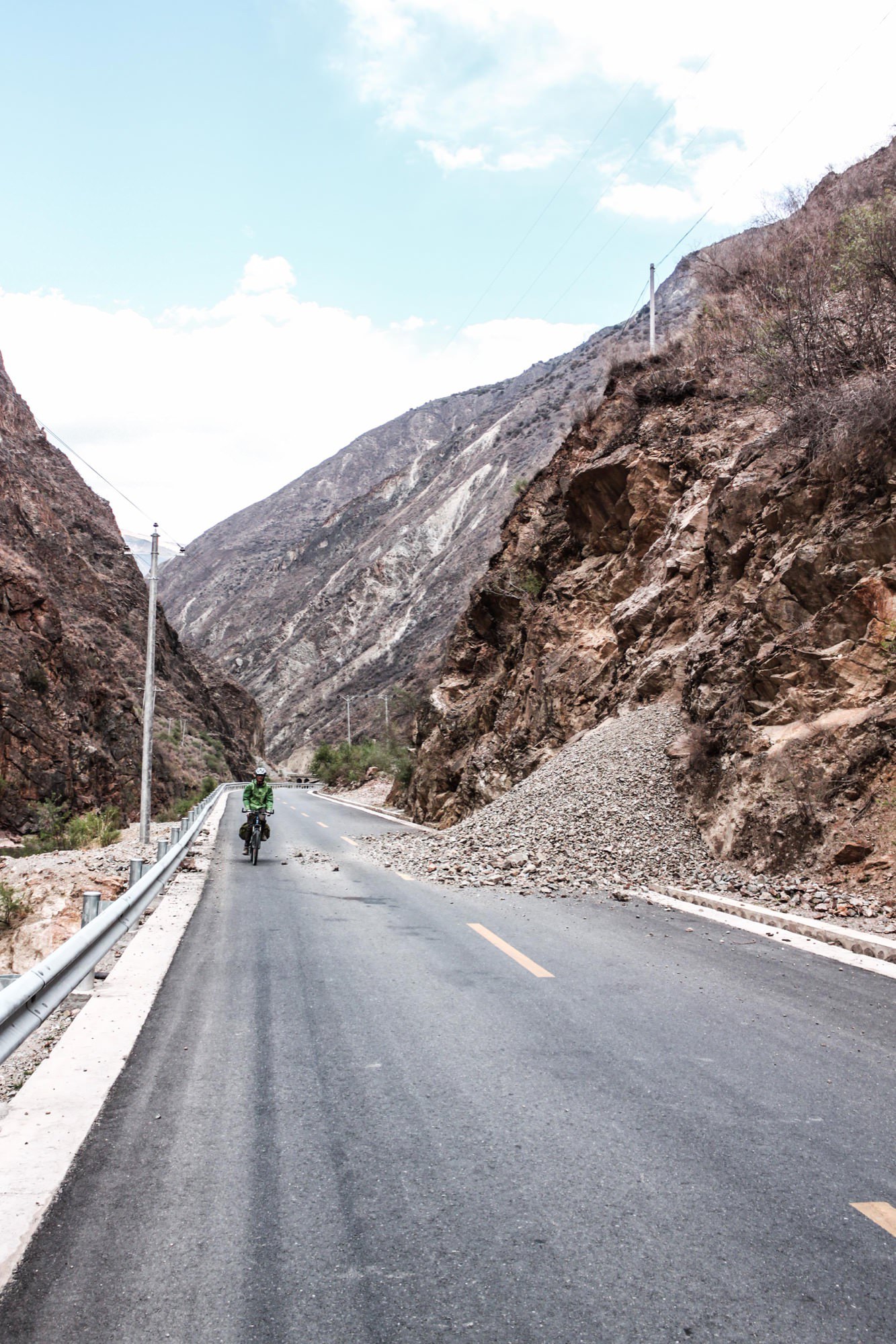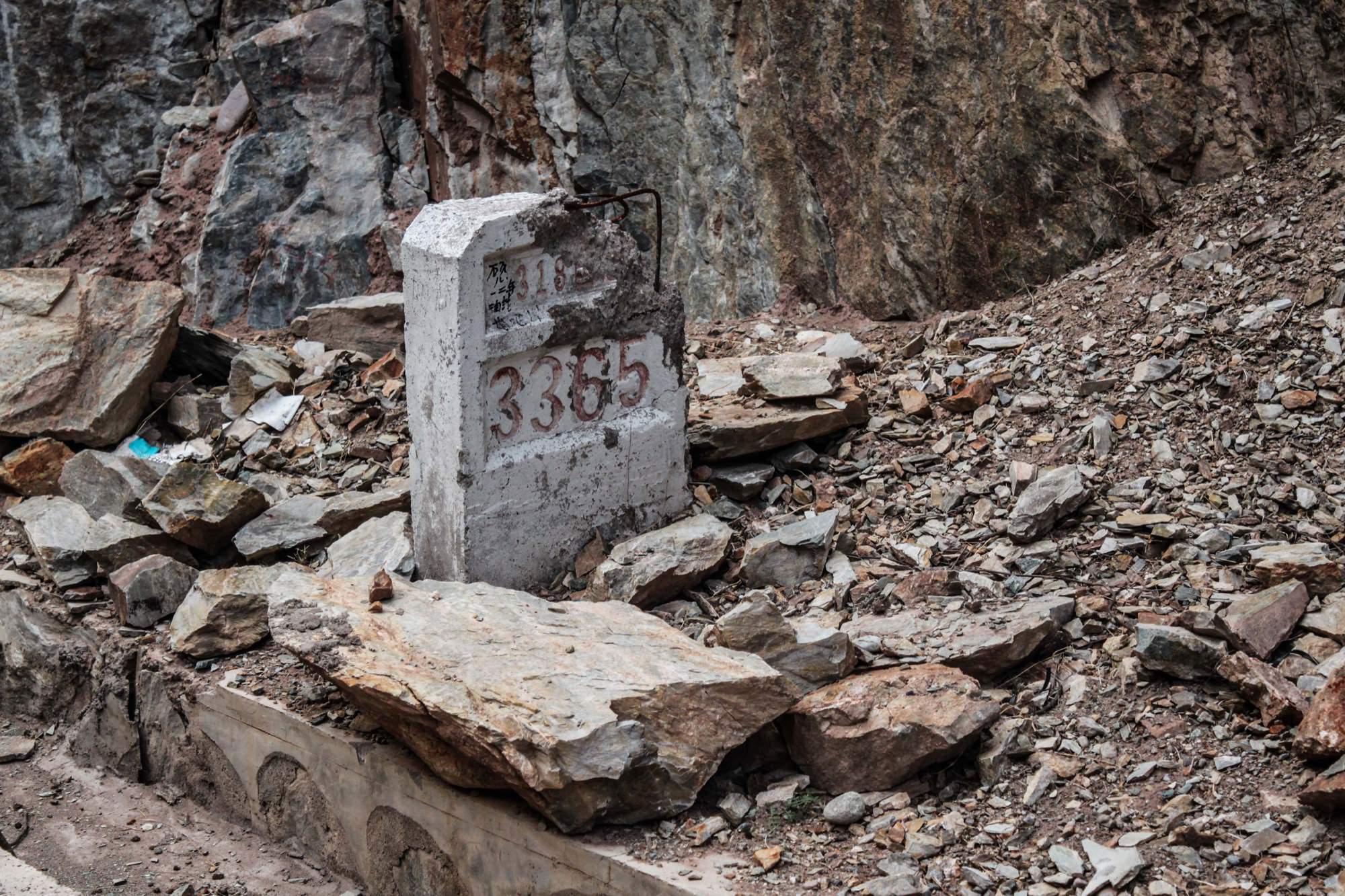 金沙江这边十分干燥,山体滑板也经常发生,路边被落石打烂的路碑。