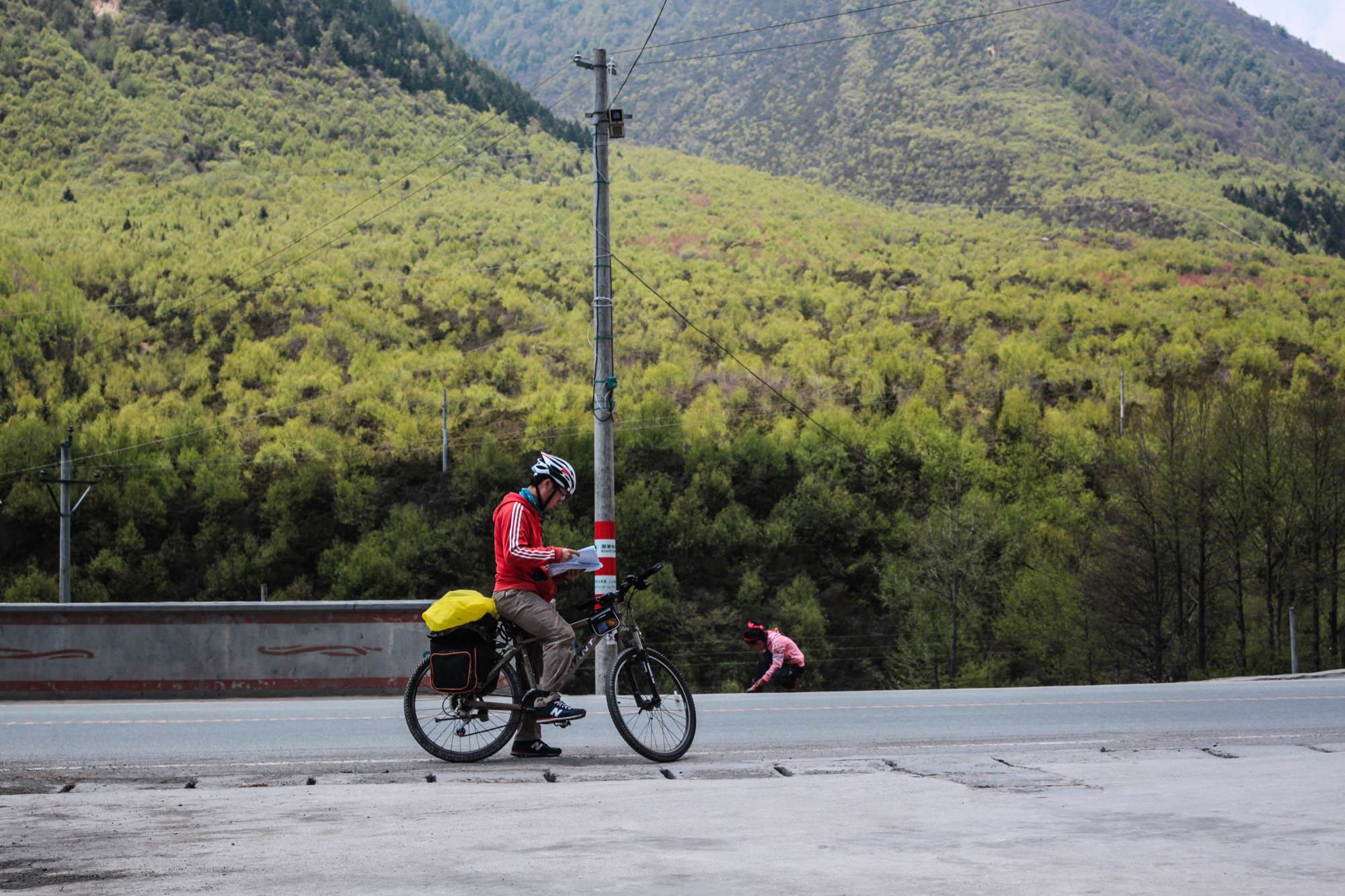 川藏线上大多路段信号都挺好的,可是当年智能手机还不是那么普及和好用,所以大多数人都还是会带上纸质的路书。爬折多山路上,一个骑友。