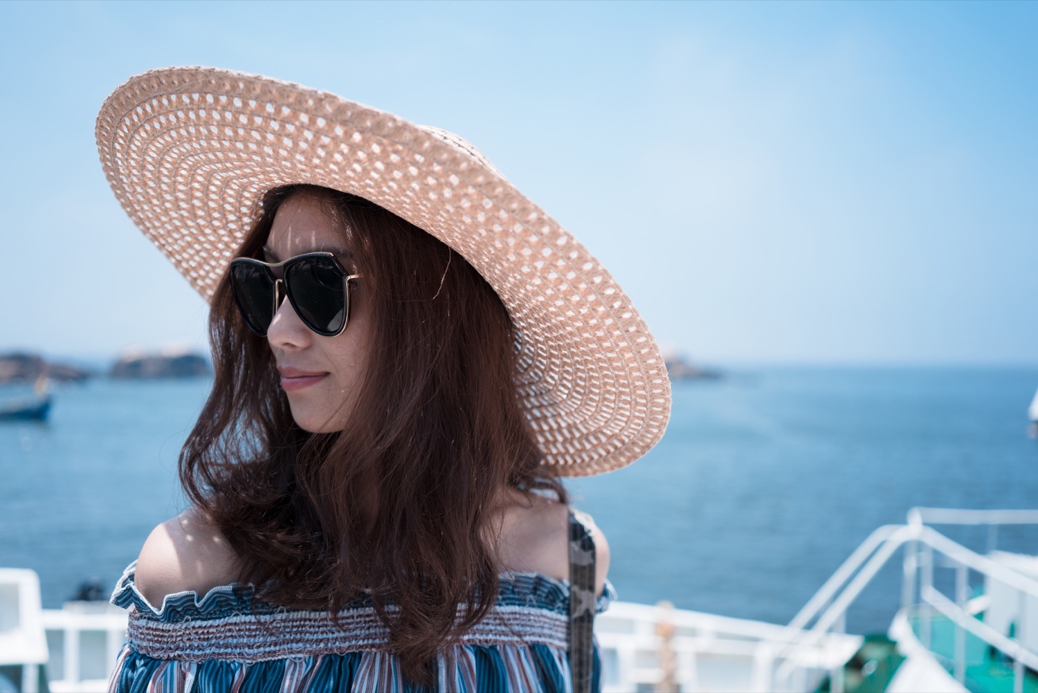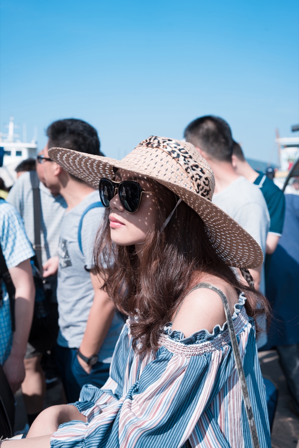 8点钟的太阳就已经很猛烈了,妹纸在码头买了一顶帽子遮阳,只要十五块钱,另外一个同事买了30块钱,实践证明还是十分管用的。