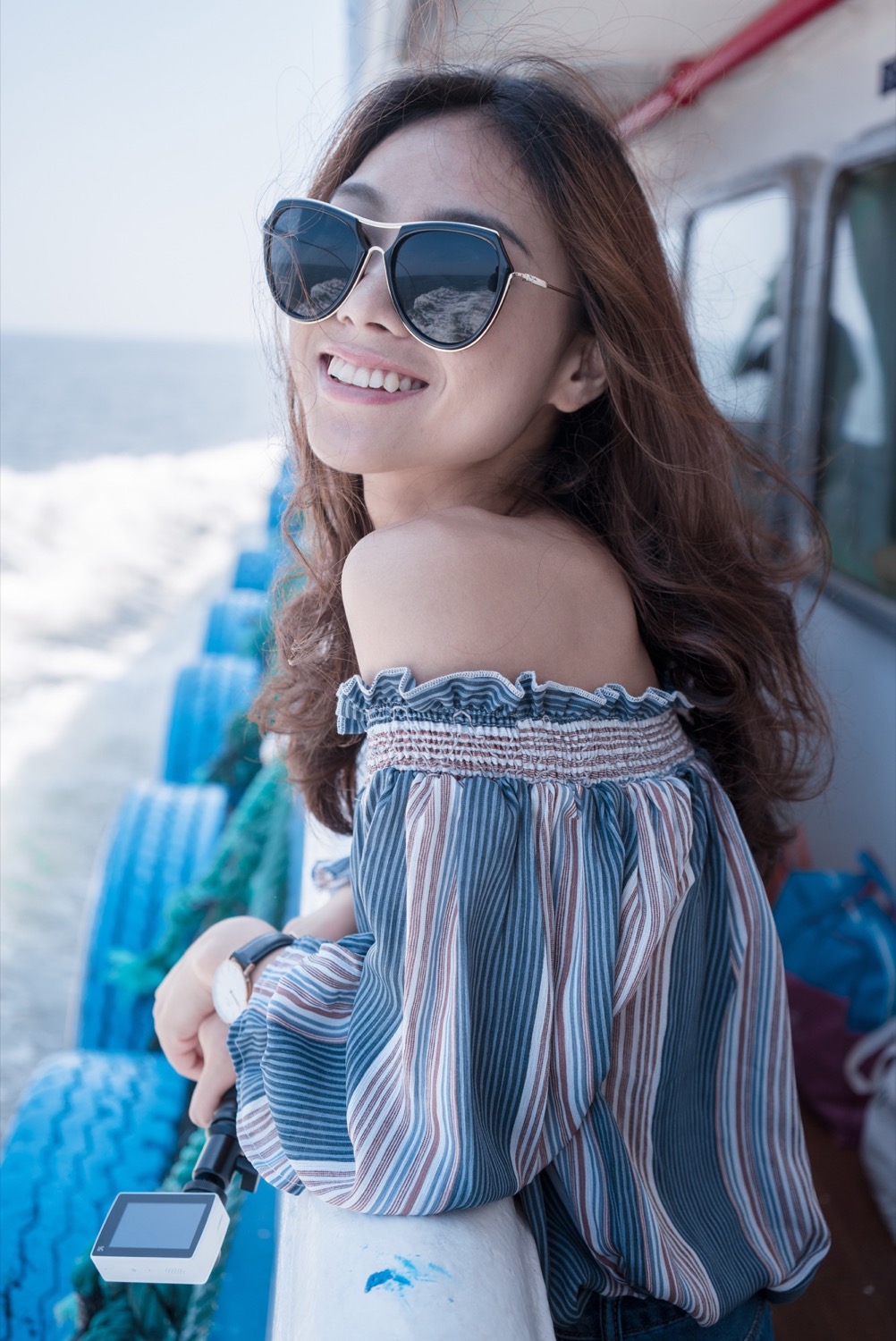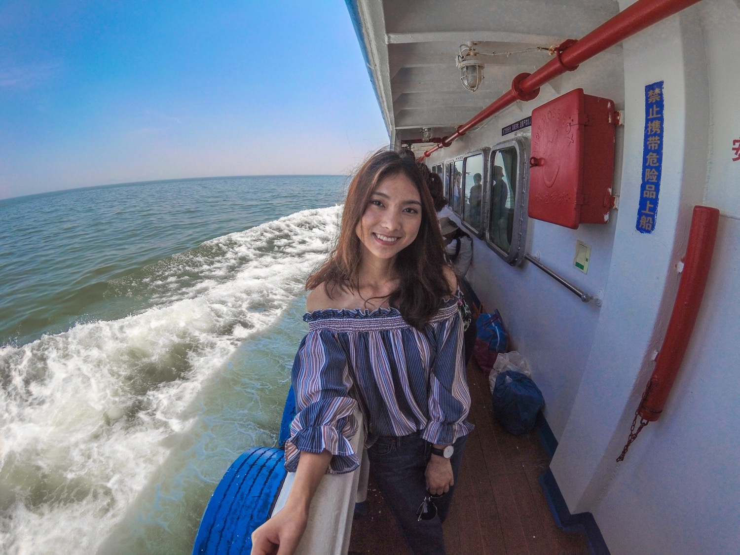 船开了约半个多小时,已经出到外海,叫妹纸来到甲板,拍几张床照船照。