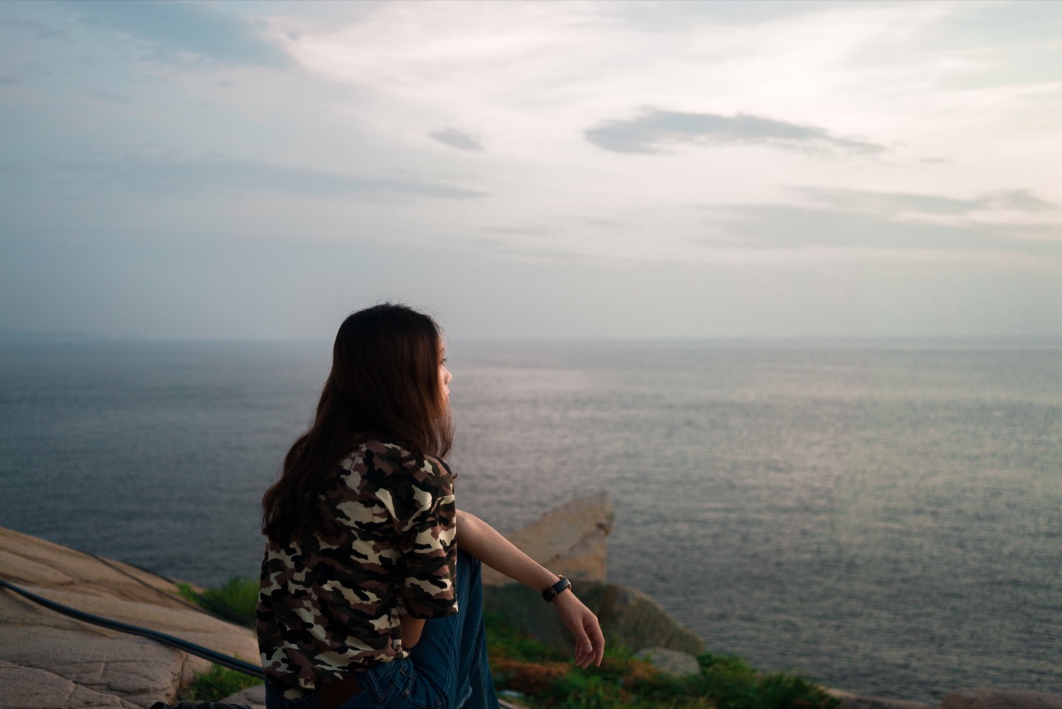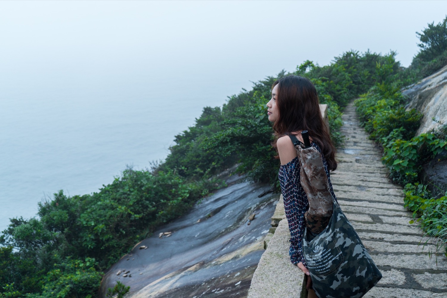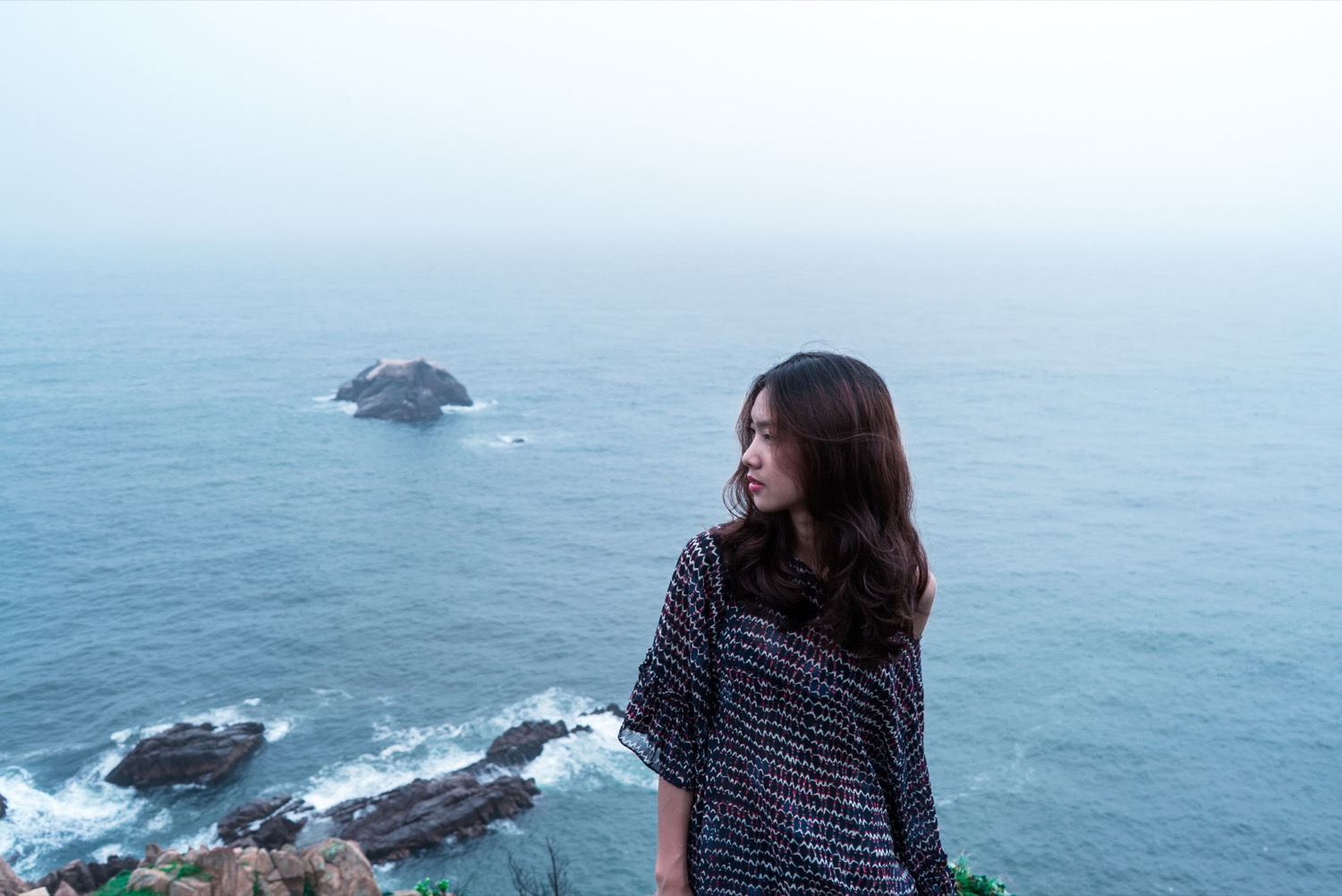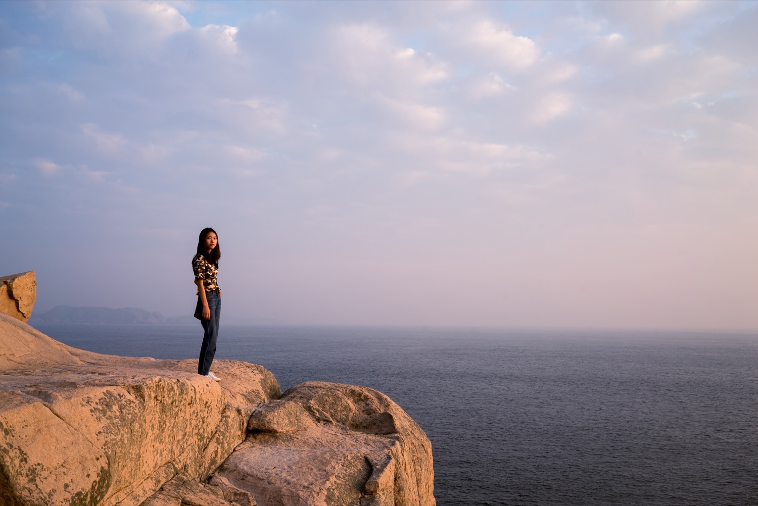 等到众人散去,妹纸一个人站在海边的悬崖上,来一张安静的照片。