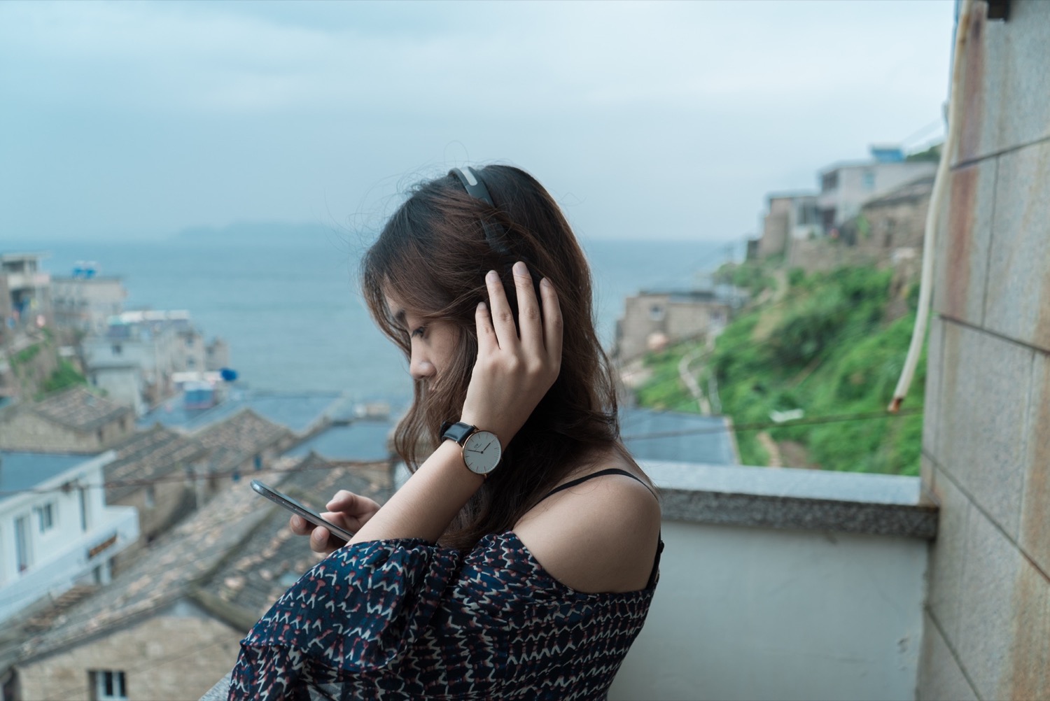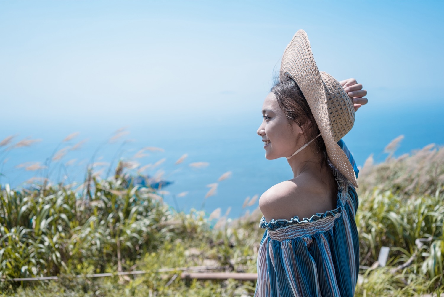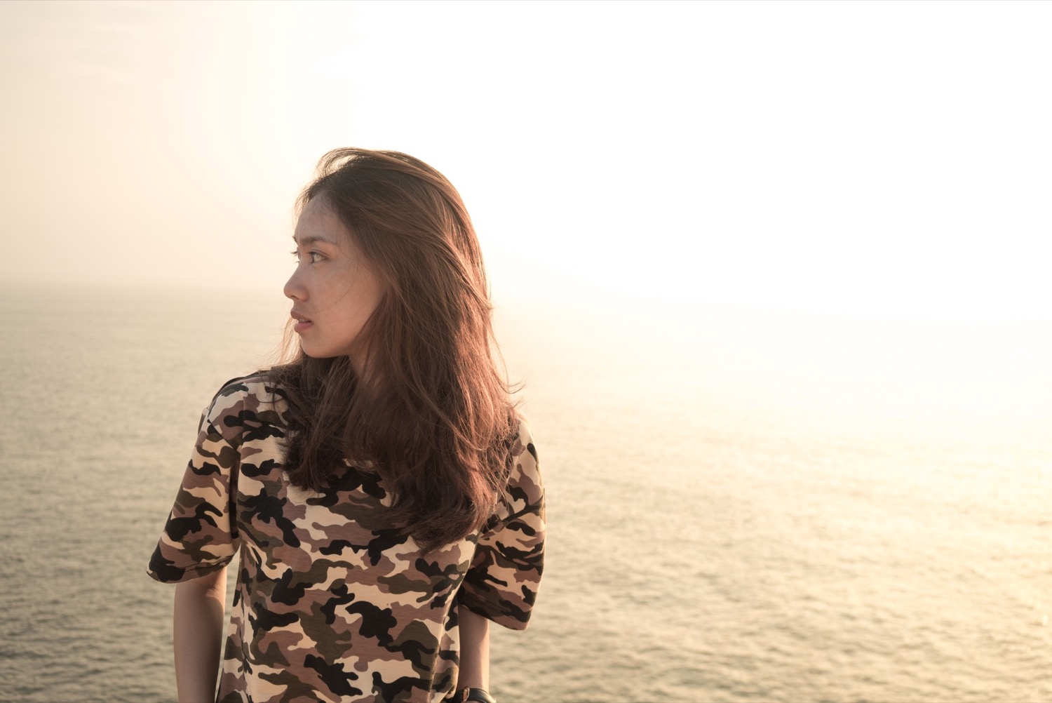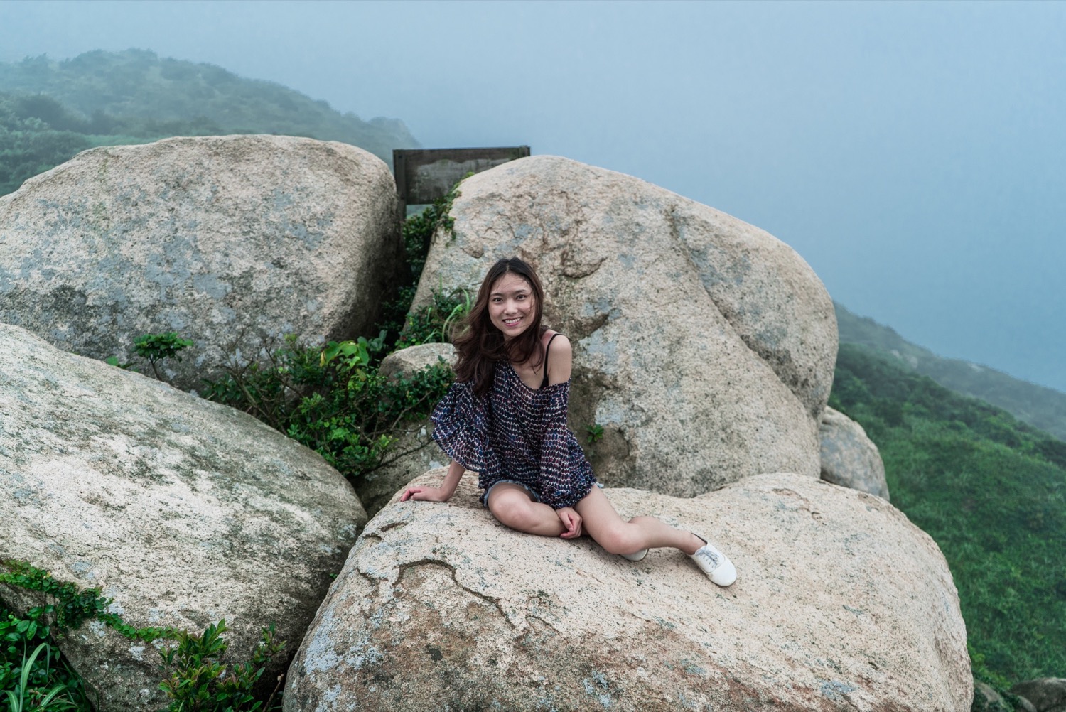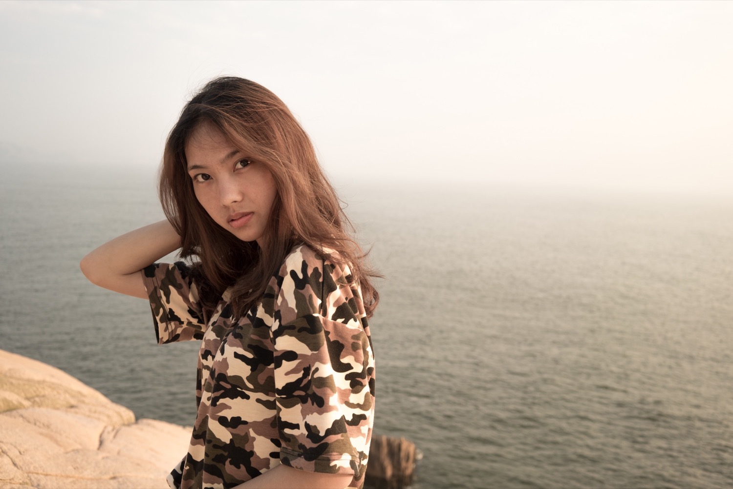 等到众人散去,妹纸一个人站在海边的悬崖上,来一张安静的照片。