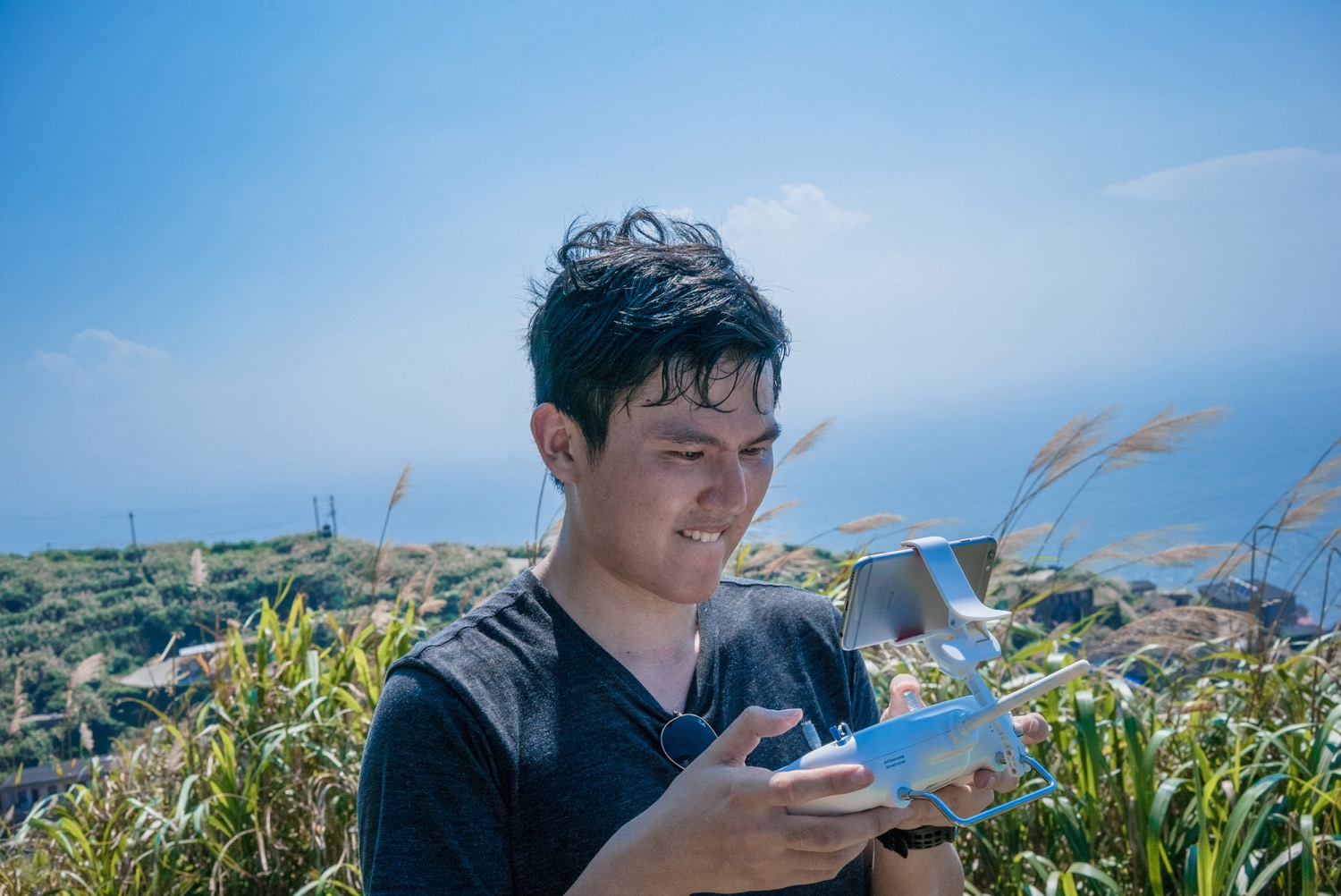 悲催的我没戴帽子,几下功夫就被太阳晒红了脸,上图是一个正在飞无人机的我。