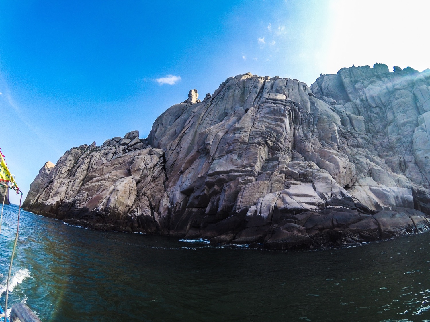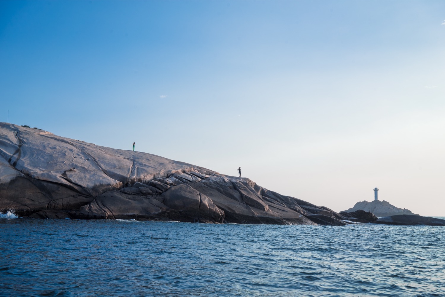 太阳要下山了,我们也起航返程了,岸边的礁石上有两个人,在上面自拍一定很爽。