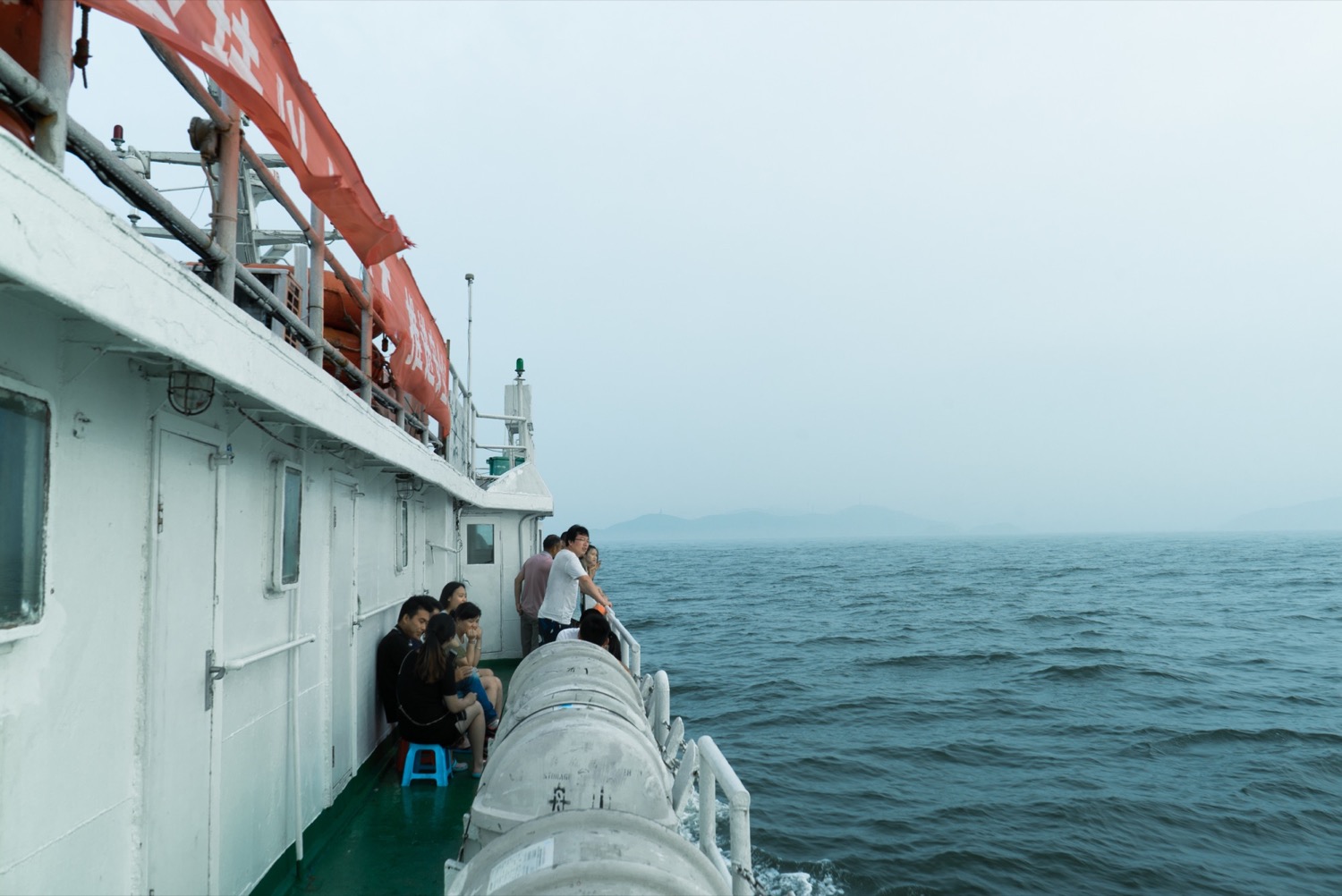 在这里还是强烈推荐大家购买中舱或者下舱,舟山出海之后风浪不小(我们出发那天天气很好风浪也不小),晕船还是挺难受的,晃悠晃悠,在下舱的晃动程度会小点,整个航程约两个小时,大家可以出发或者中途休息的时候自己上去夹板拍照,其他时间建议大家还是坐着休息吧。