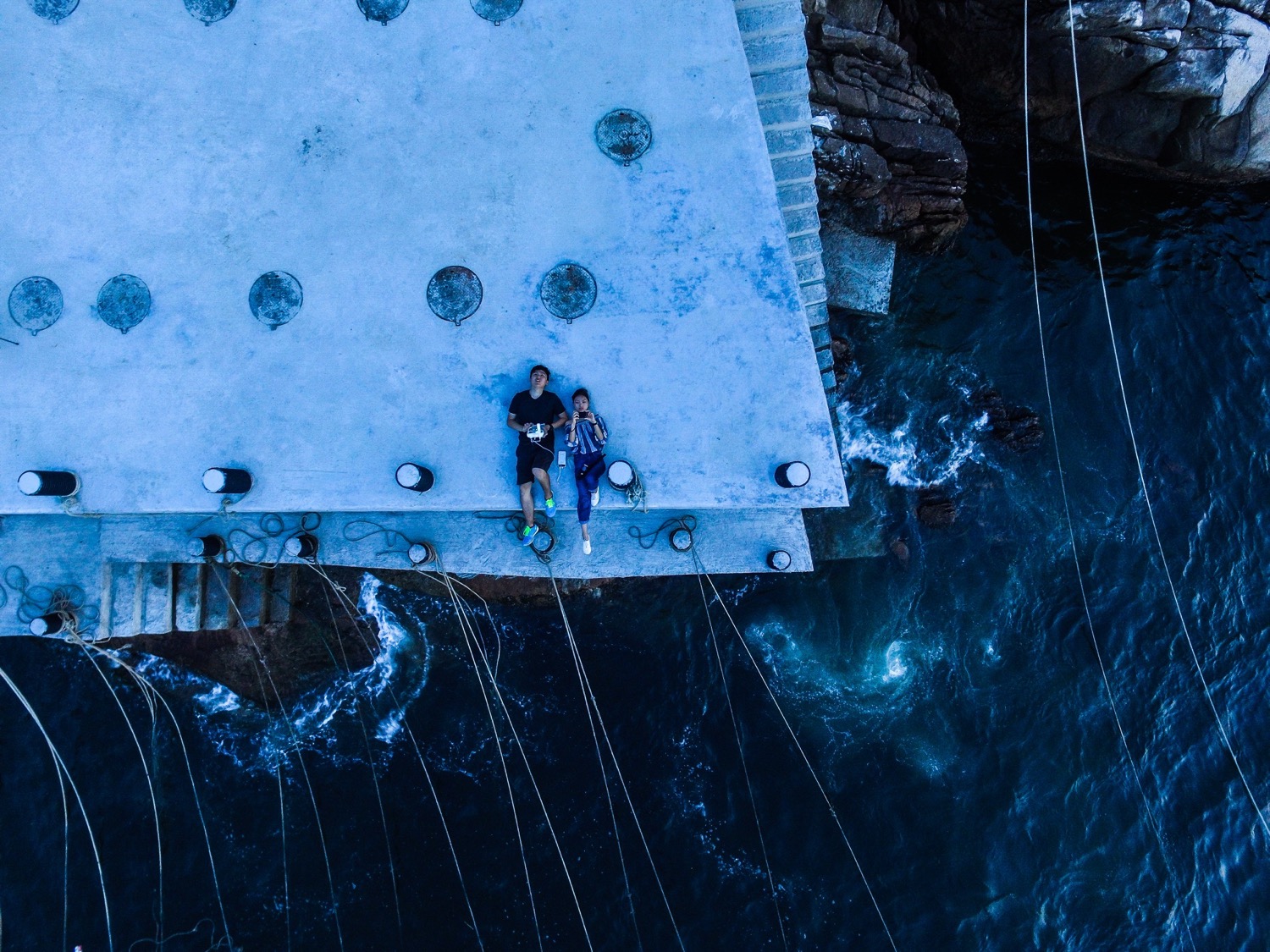 趁着码头没人,让无人机飞到我们的正上方,来一张两人合照。