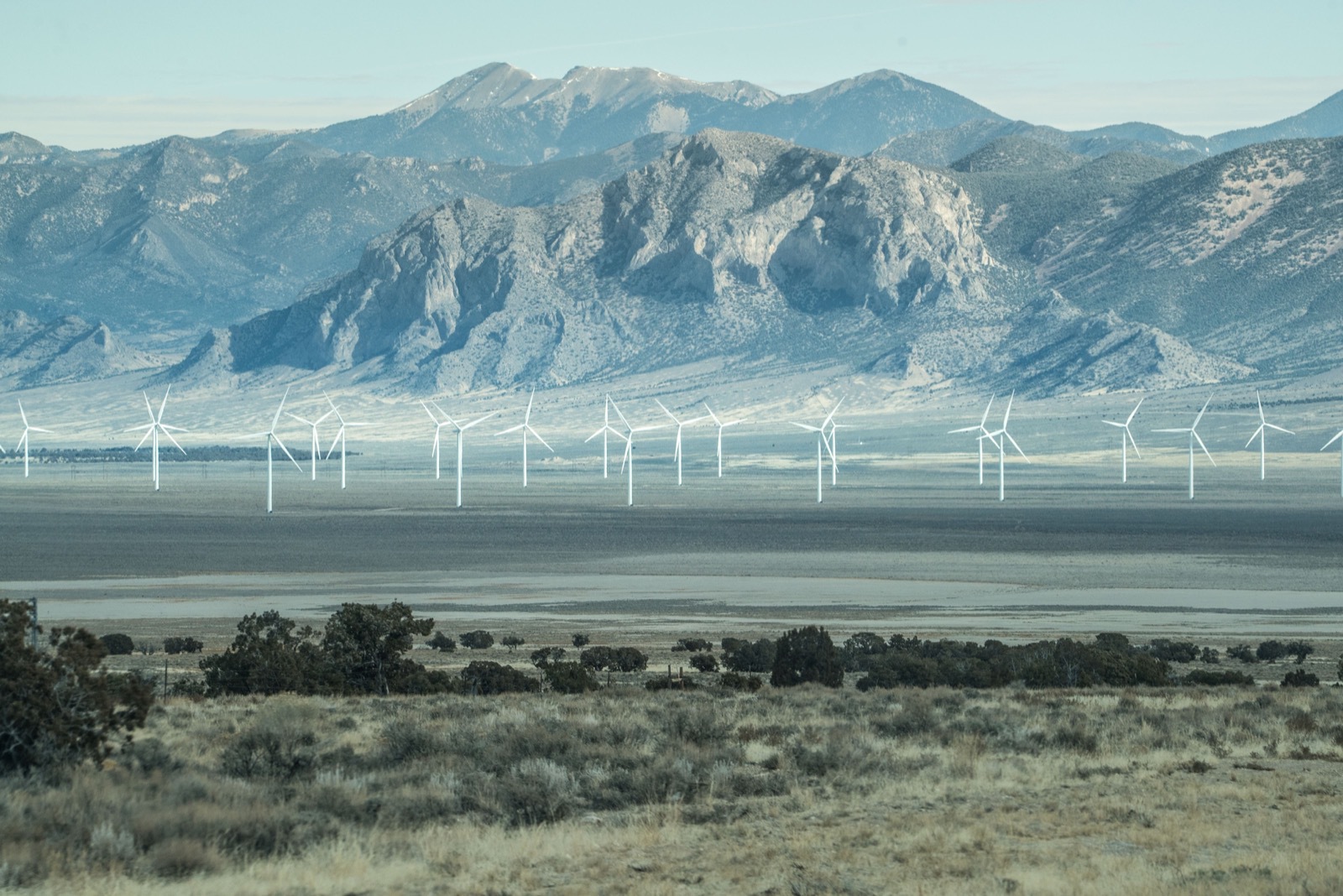 离开小盐湖,慢慢靠近盐湖城了,地貌也发生了变化,远处见到一片风车,新能源发电。