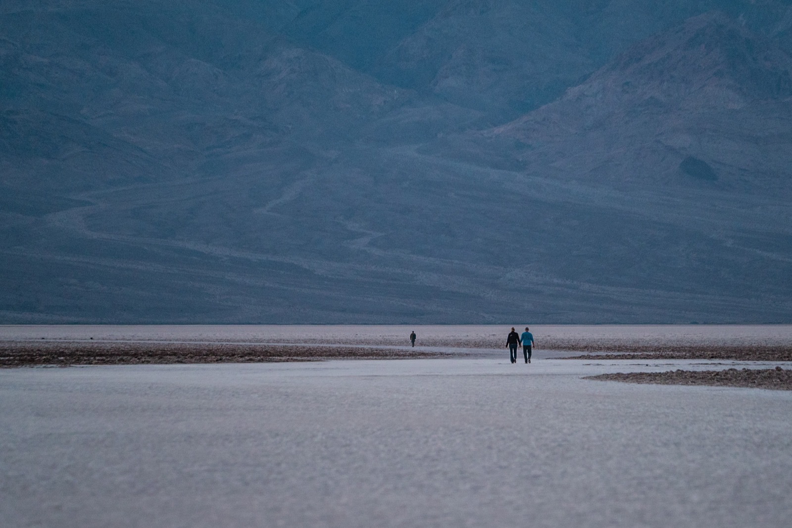 有句话说「不到恶水盆地,就没来过死亡谷」,到达恶水盆地时太阳已经落下,恶水盆地是北美洲的最低点,真的有水,很咸(没错,我尝了下),盆地冬季大多地方都是干涸的,可以走在盆地上。