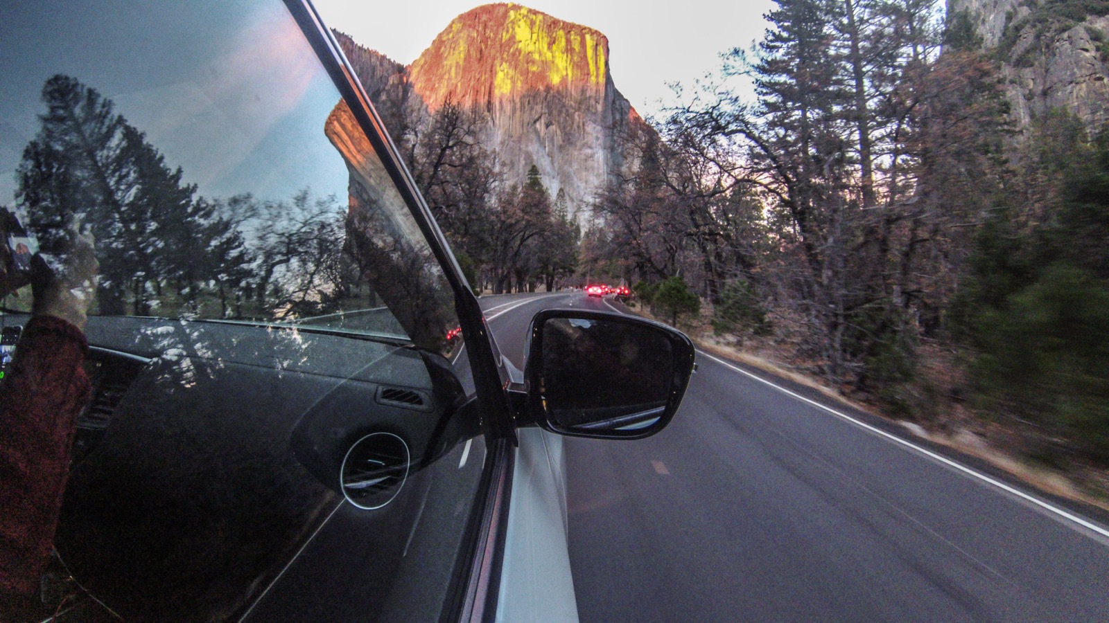 进入优胜美地国家公园,比较奇怪的是,门口居然没有人收门票,搞得我都以为自己「被逃票」了。把运动相机通过吸盘粘在车窗上,勇敢点,也能拍出独特视角的照片和视频。前面就是苹果桌面,阿不,半圆顶。