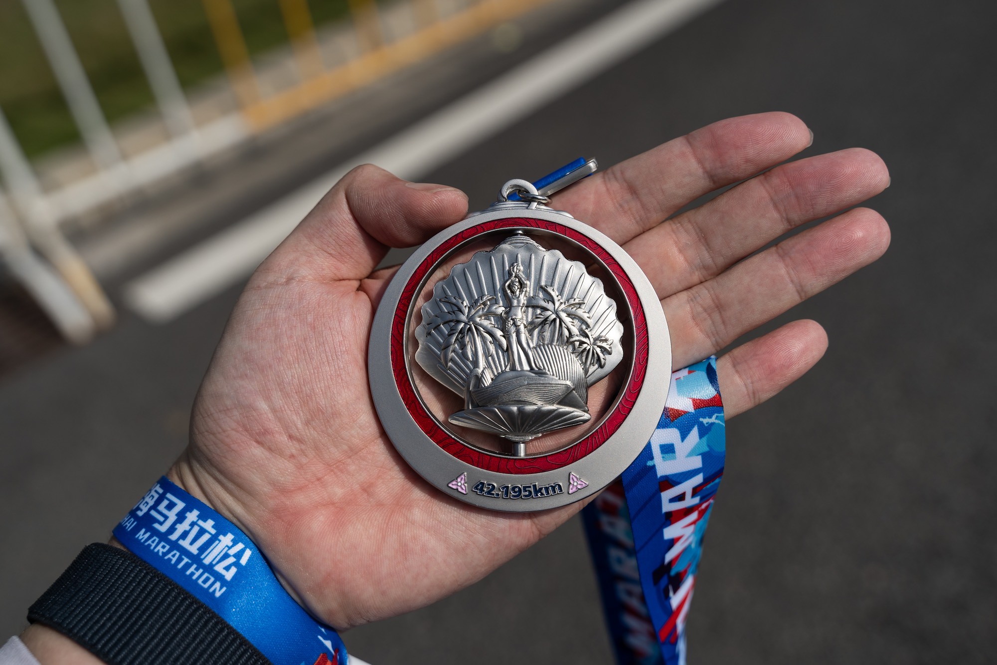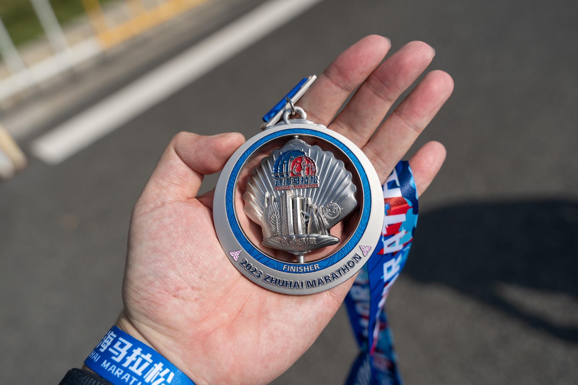这就是这次珠海马拉松的奖牌,中间可以旋转,背后是珠海渔女的图案,还是挺有特色的。