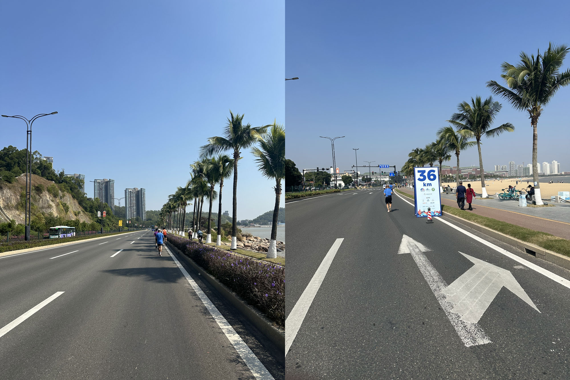 珠海马拉松,除了开头的 10 公里,后面基本全程都是在海边。头 10 几公里,我的状态十分好,配速也很稳定,很享受这种时刻,为了不打乱自己的跑步节奏,头两个小时我基本没有拿手机拍照。