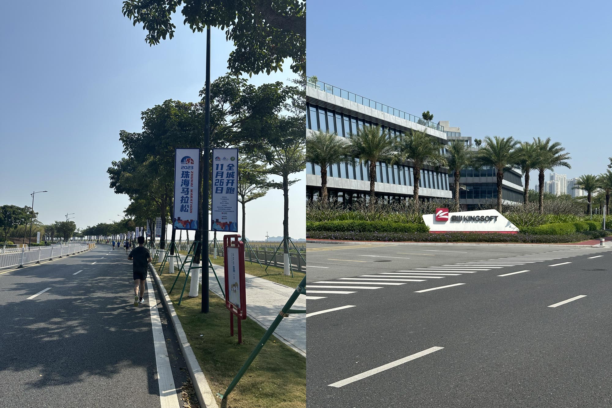 随着时间的推移,天气越来越热,这个时候我也不太想跑了,开始数路上的公里牌,每隔 2 公里一个补给点还是挺爽的,我基本上每进一个补给点,都会喝半杯能量饮料,一两杯水,如果有香蕉也会补充两根。过了 30 多公里,路上的人也越来越少,大家也多是走走停停。路上还见到了金山的珠海总部,也算是我的前司吧。