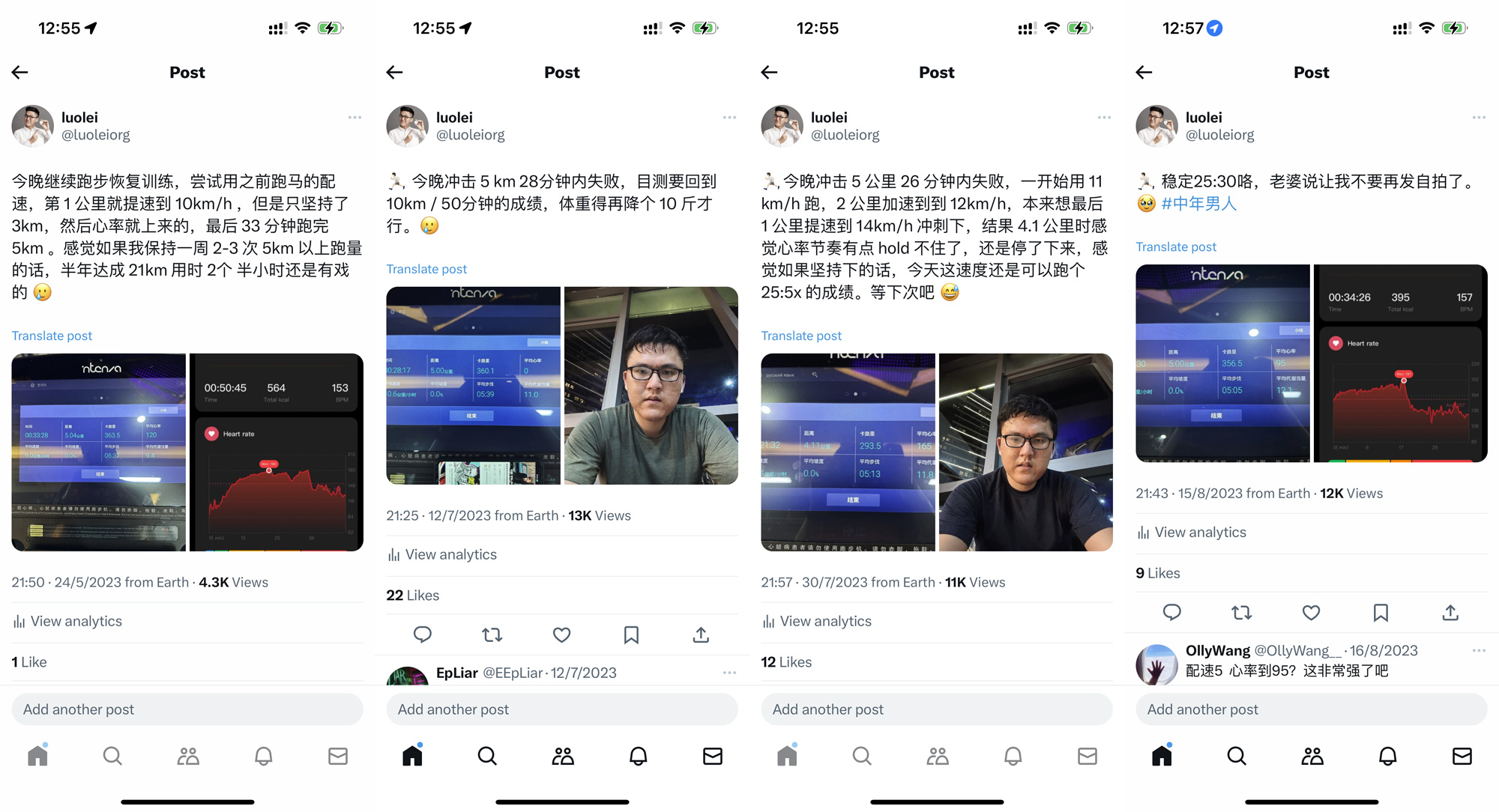 我每周固定在周二和周四的晚上,以及一个周末的任意一天去健身房跑步机训练。由于时间有限,每次只跑 5 公里。我的成绩从最开始恢复跑步时的 30 多分钟逐渐提高,最后能够稳定地在 25-26 分钟内完成 5 公里。