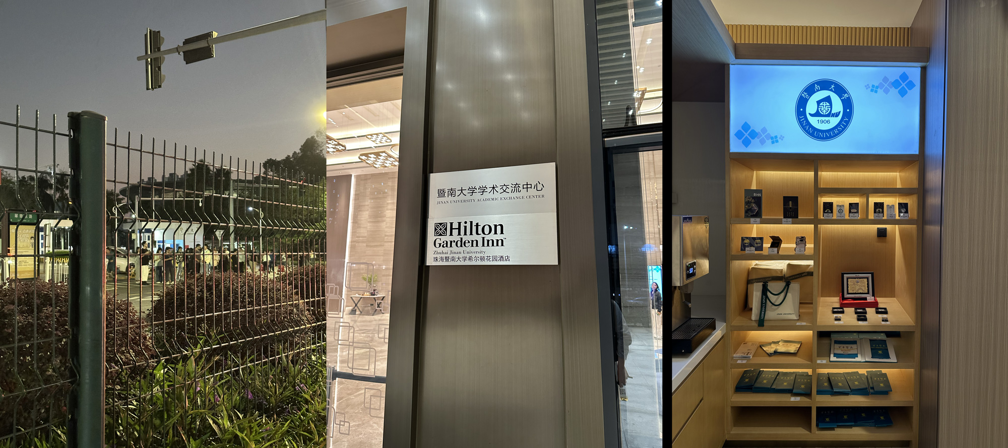 检录完后,和老婆就回酒店了,这次起跑的地方在珠海体育中心,距离我之前的大学校区不远,发现我们学校附近居然开了一个「珠海暨南大学希尔顿花园酒店」,这次就住在这里,路过校园门口的时候,还拍了一张照片。大一的之后,曾经短暂在珠海校区学习过一年,弹指之间,已经是13年前的事情了。